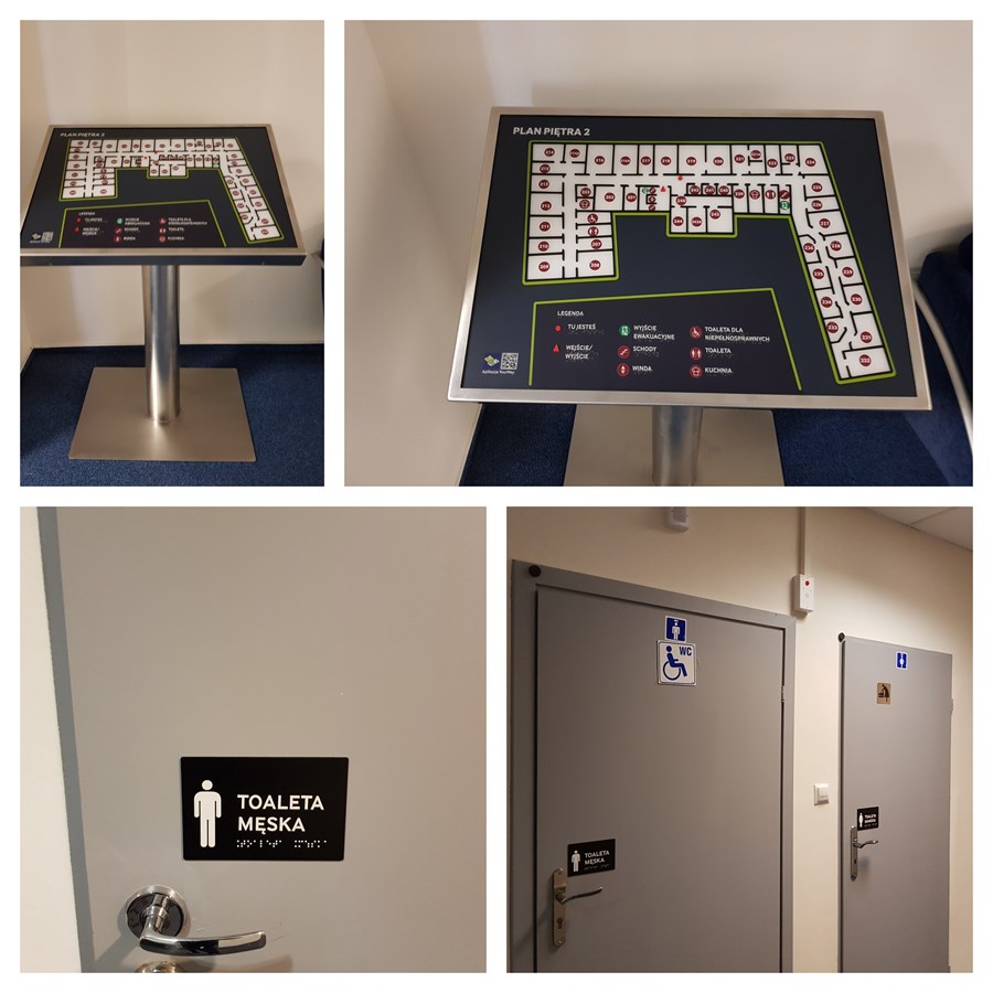 Wykonano trzy wielobarwne, tyflograficzne plany informacyjne ze znacznikami YourWay Beacon i NFC umieszczone na stojakach, tyflograficzne, czarno-białe tabliczki informacyjne na drzwi, także ze znacznikami YourWay Beacon i NFC, metalowe tabliczki informacyjne na poręcze schodów, oznaczenia pierwszego i ostatniego stopnia schodów w postaci szaro-metalicznych listew, oznaczenia przeszkleń drzwi. Zamontowano system przywoławczo-alarmowy Call-Hear. Dostarczono krzesło ewakuacyjne, przenośną pętlę indukcyjną, wykonano system nagłośnieniowy, zamontowano znacznik YourWay Plus.
