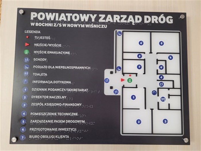 Tyflograficzne tabliczki informacyjne zostały zamontowane na drzwiach. Ich kolorystyka jest kompatybilna z kolorystyką planu informacyjnego – biel, czerń i barwa czerwona. Tabliczki zawierają piktogramy i napisy w czarnym druku i w brajlu.