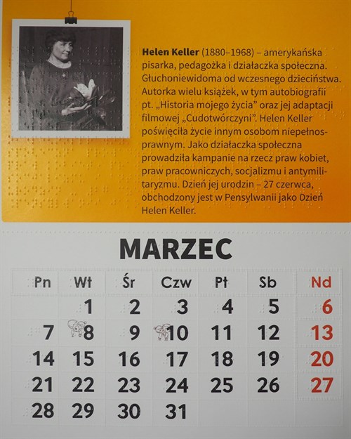 Z kolejnymi miesiącami poznajemy kolejne zasłużone w historii globu osoby z dysfunkcją wzroku, jak obecną na załączonym obrazku Helen Keller, wybitną amerykańską działaczkę na rzecz osób z niepełnosprawnościami.