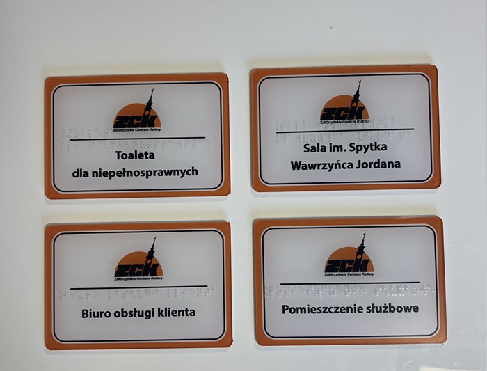 Specjaliści Altixu wykonywali ostatnio realizację tyflograficzną w Zakliczyńskim Centrum Kultury. Na potrzeby placówki powstała tablica informacyjna ze znacznikami YourWay Beacon i NFC, z rycinami i z opisem w czarnym druku i w brajlu, zawierającym rys historyczny budynku. Wykonano także nieco mniejszą tablicę w czarnym druku i w brajlu zawierającą dane adresowe i godziny otwarcia placówki, ale też 21 tabliczek czarnodrukowo-brajlowskich opisujących poszczególne sale, pokoje i toalety.