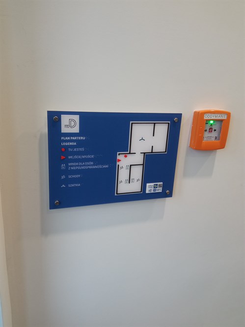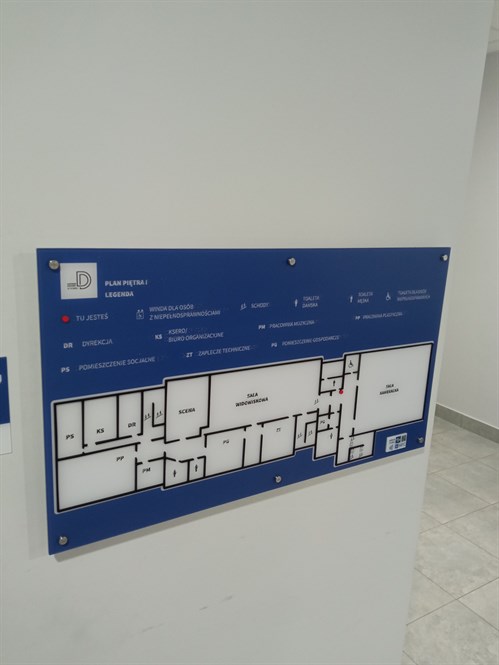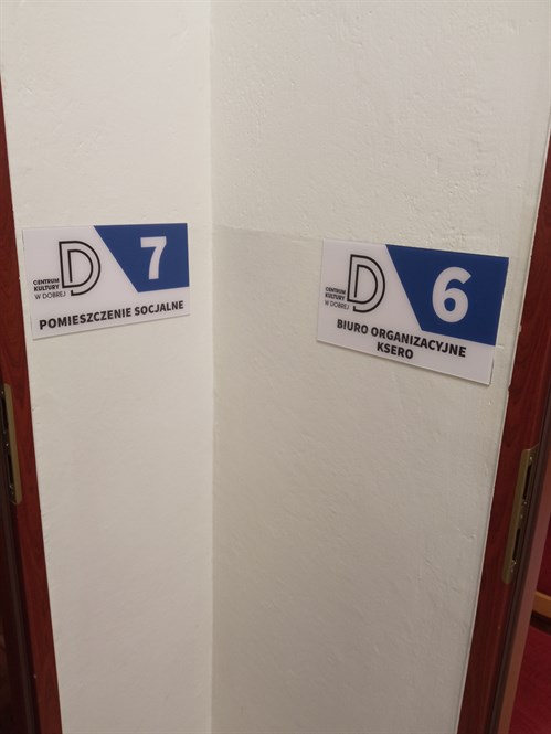 W budynku Centrum Kultury w Dobrej wykonane zostały dwa dotykowe plany informacyjne ze znacznikami YourWay Beacon i NFC, tabliczki informacyjne w brajlu i w czarnym na drzwi. Plany informacyjne parteru i pierwszego piętra budynku mają postać tablic z PMMA utrzymanych w niebiesko-biało-czarnej kolorystyce. Umieszczone są na ścianach, w pionie, na dystansach. Opatrzone zostały legendami w czarnym druku i w brajlu, a także znacznikami YourWay Beacon i NFC. Mniejsze tabliczki informacyjne z PMMA utrzymane są także w niebiesko-biało-czarnej kolorystyce. Zawierają napisy w brajlu i w czarnym druku oraz informacje wizualne, np. w przypadku oznakowania toalet.