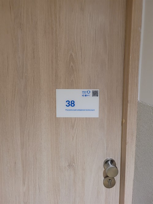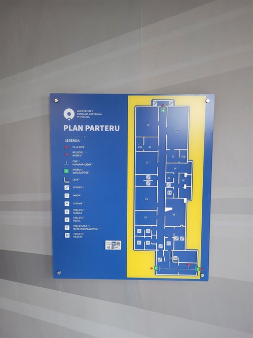 Dotykowe plany informacyjne mają postać niebiesko-żółto-białych tablic, wyposażonych w legendy opatrzone czarnodrukowymi i brajlowskimi napisami. Wykonane są w całości z tworzywa PMMA i usytuowane w pionie, na ścianach, na dystansach. Prezentują topografię parteru, a także pierwszego, drugiego i trzeciego piętra obiektu. Wyposażone są we wspomniane już znaczniki YourWay Beacon i NFC. Realizacja obejmuje też biało-niebieskie tabliczki informacyjne na drzwi wykonane z tworzywa PMMA, opatrzone znacznikami NFC, z których odczytać można dane dotyczące wybranego gabinetu, pokoju czy sali.