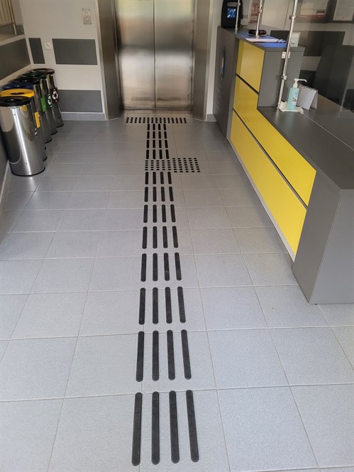 Na parterze obiektu zostały zamontowane linie naprowadzające i pola uwagi. Wszystkie elementy szklane i słupy zostały oklejone pasami ostrzegawczymi. Krawędzie pierwszego i ostatniego stopnia schodów wyposażono w nakładki ostrzegawcze w postaci listew.