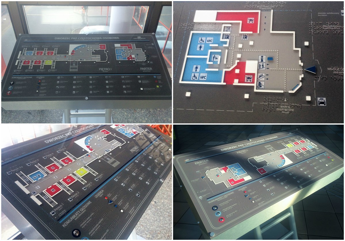 W skład realizacji wchodzą udźwiękowione, dotykowe plany informacyjne w budynku dworca PKP w Częstochowie. Mają one postać ergonomicznie pochylonych tablic, usytuowanych na drabinkowych, stalowych stojakach. Plany są utrzymane w kolorystyce korespondującej z architekturą wnętrza dworcowego budynku. Przeważają jasne i grafitowe szarości z elementami w kolorze niebieskim, żółtym i czerwonym. Tablice są opatrzone metalowymi przyciskami, po których wciśnięciu podróżny otrzymuje głosowe informacje, właściwe dla wybranego elementu legendy. Legenda jest ponadto opisana w czarnym druku i w brajlu.