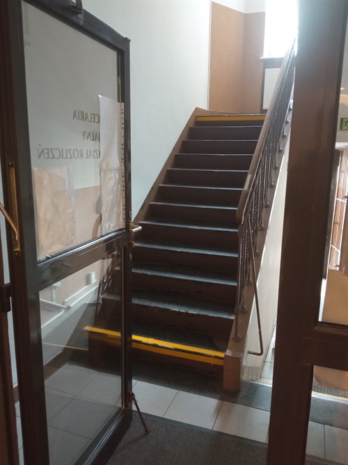 Czarne tabliczki informacyjne z tworzywa PMMA, z białym liternictwem, zostały umieszczone na drzwiach. Znajdują się na nich napisy zarówno w czarnym druku, jak i w brajlu, adekwatne do przeznaczenia gabinetu, na którego drzwiach zostały zamontowane.