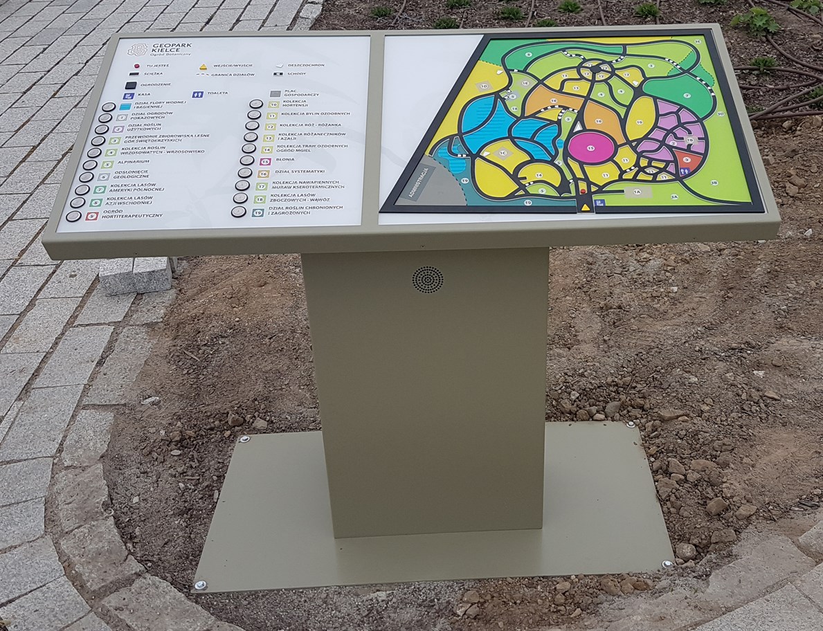 Dla ogrodu botanicznego Geopark Kielce zrealizowany został udźwiękowiony, dotykowy plan informacyjny. Plan ogrodu jest wielobarwną, ergonomicznie pochyloną tablicą, usytuowaną na stalowym postumencie. Dotykowy plan został wyposażony w czarnodrukową i brajlowską legendę, dodatkowo udźwiękowioną. Po wciśnięciu przycisku, zwiedzający otrzymuje głosową informację na temat elementu, obok którego znajduje się przycisk.