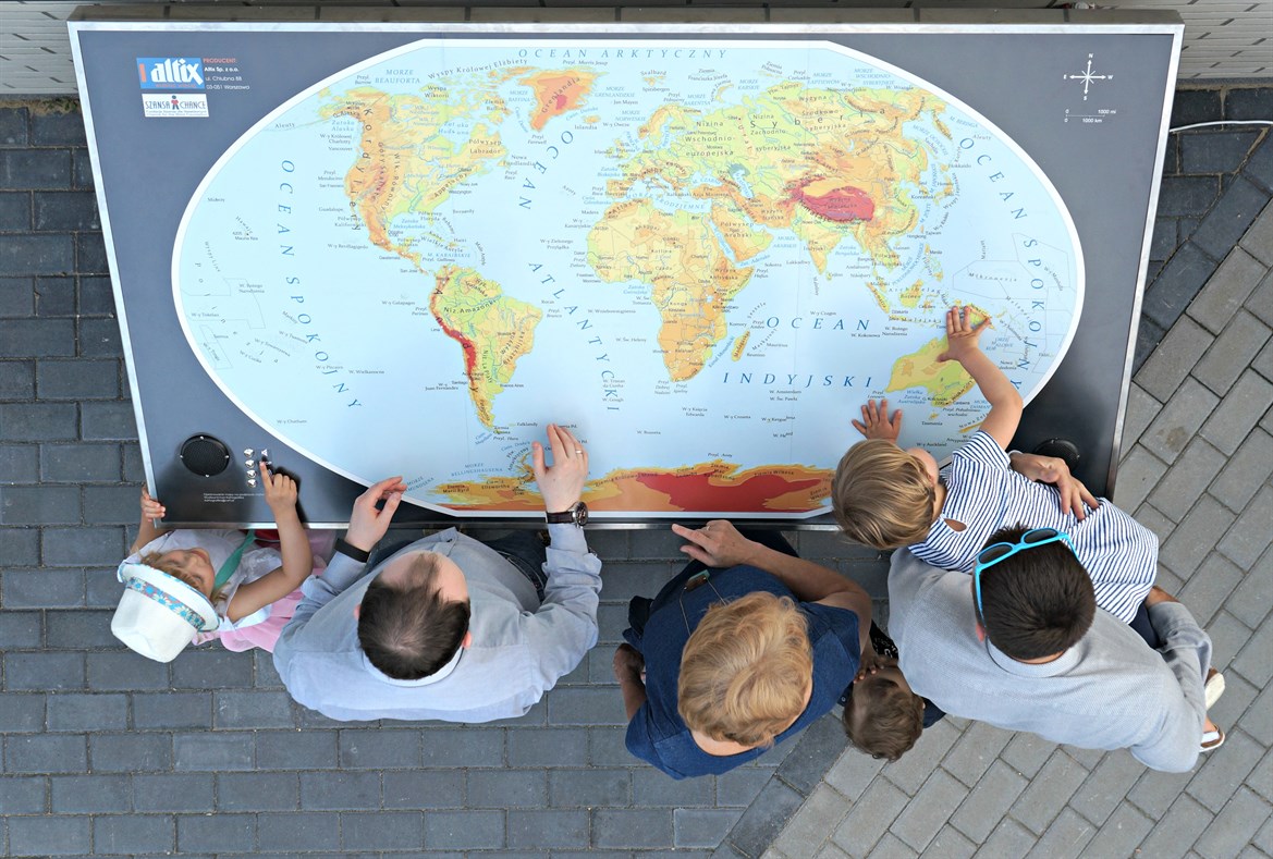 Realizację tę stanowi interaktywna mapa świata. Jest ona swego rodzaju terminalem informacyjnym stworzonym przez naszą firmę. Duża, wypukła, dotykowa powierzchnia pozwala ze szczegółami zaprezentować mapę kuli ziemskiej. Mapa jest udźwiękowiona. Dotknięcie określonego elementu powoduje odczytanie jego nazwy. Ponowne dotknięcie tego samego elementu skutkuje odtworzeniem nagrania, zawierającego bardziej szczegółowe informacje o określonej lokalizacji. Terminal mieści około stu pięćdziesięciu udźwiękowionych obszarów. Z lewej strony umieszczono metalowe przyciski sterujące. Umożliwiają one zmniejszenie lub zwiększenie głośności komunikatów głosowych lub czasowe ich wyłączenie. Mapa stanowi niezastąpioną pomoc dydaktyczną dla osób z dysfunkcjami wzroku. Zarówno dla tych młodszych, jak i starszych.