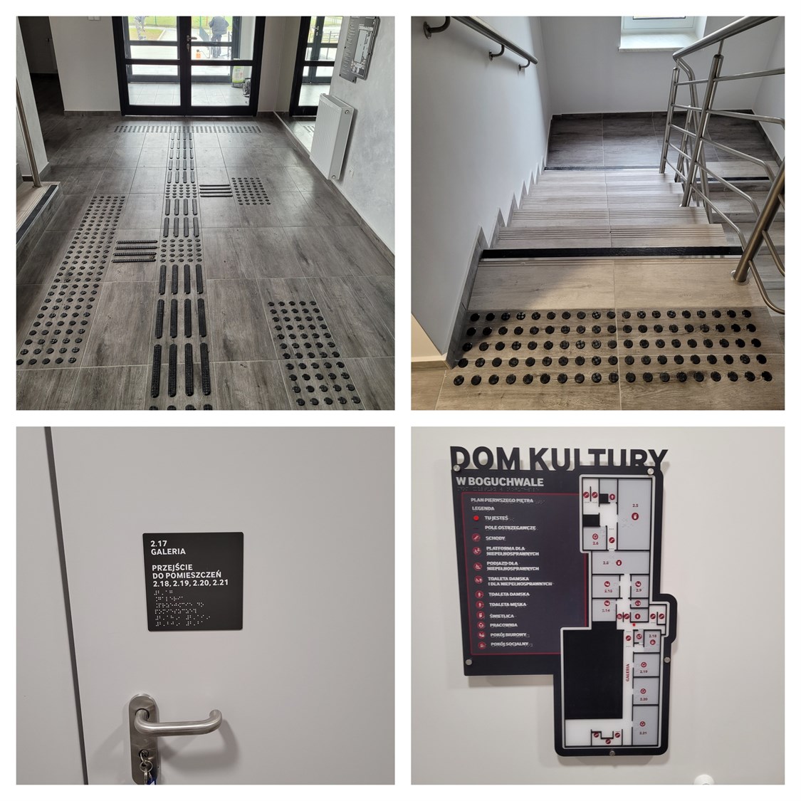 Realizacja obejmuje trzy plany informacyjne PMMA z beaconami YourWay, tabliczki PMMA na drzwi z brajlowskimi napisami i z piktogramami, linie i pola uwagi oraz nakładki na schody. Tablice z planami informacyjnymi, z napisami w brajlu i w czarnym druku, utrzymane są w czarno-białej kolorystyce z czerwonymi elementami. Znajdują się na ścianach, zostały zamontowane w pionie. Prezentują plany w perspektywie zależnej od tego, gdzie zostały umieszczone. Plany informacyjne usytuowane są centralnie i z prawej strony tablicy i są wysunięte poza jej obrys, zaś legenda znajduje się z lewej strony. W skład realizacji wchodzą także tabliczki PMMA na drzwi z informacjami wizualnymi, np. z oznakowaniem toalet czy przejść do galerii, a także z brajlowskimi napisami. Ponadto realizacja obejmuje linie i pola uwagi, a także nakładki na schody.