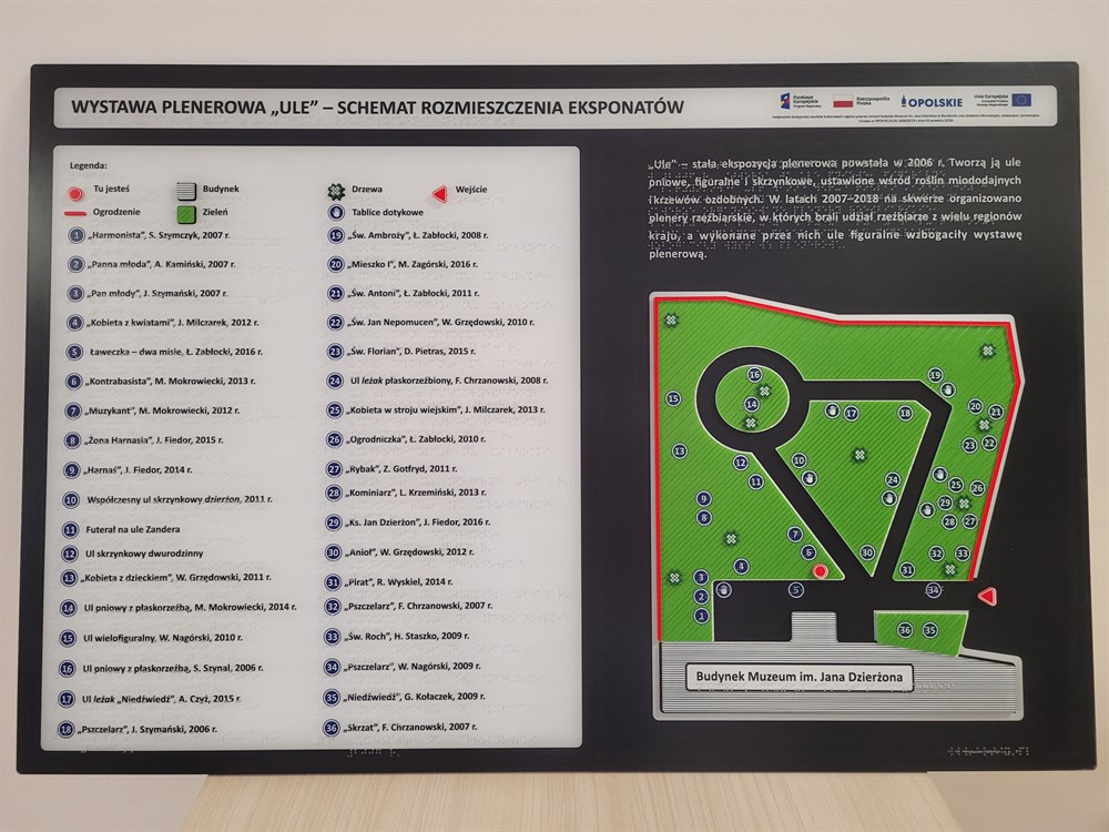 Realizacja obejmuje dotykowy plan rozmieszczenia eksponatów pszczelarskich na plenerowej, stałej ekspozycji w Muzeum im. Jana Dzierżona w Kluczborku i siedem dotykowych obrazów termoformowanych o tematyce pszczelarskiej. Tablica z planem została wykonana z tworzywa PMMA, zwanego szkłem organicznym, odpornego na warunki atmosferyczne, zadrapania i uszkodzenia. Kolorystyka to czerń, biel i zieleń z drobnymi elementami w kolorze czerwonym. Tablica zostanie umieszczona na postumencie wykonanym przez zleceniodawcę. Jest ona podzielona niemal przez pół. W prawej jej części znajduje się dotykowy plan rozmieszczenia eksponatów, zaś w lewej usytuowana jest kompleksowa, duża legenda w czarnym druku i w brajlu. W skład realizacji wchodzi ponadto siedem obrazów termoformowanych o tematyce pszczelarskiej. Można je zarówno oglądać, jak i badać dotykiem.
