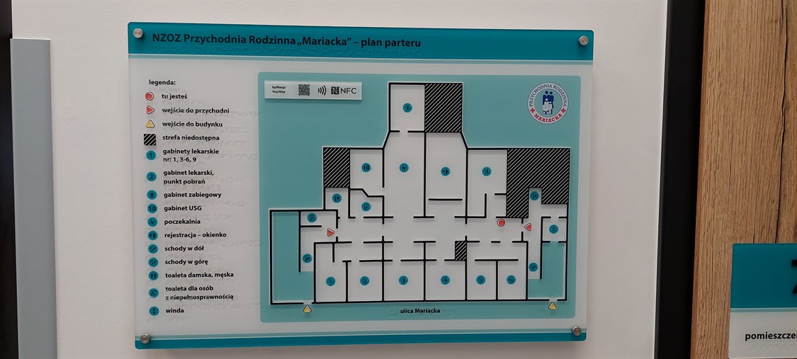 W Niepublicznym Zakładzie Opieki Zdrowotnej „Mariacka” w Nysie wykonano dotykowy plan informacyjny ze znacznikami YourWay Beacon i NFC, tabliczki informacyjne w czarnym druku i w brajlu, ponadto nad drzwiami przychodni umieszczono znacznik YourWay Beacon.