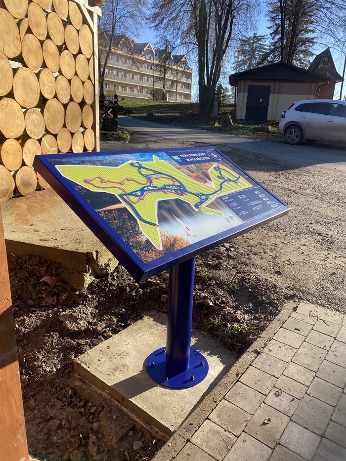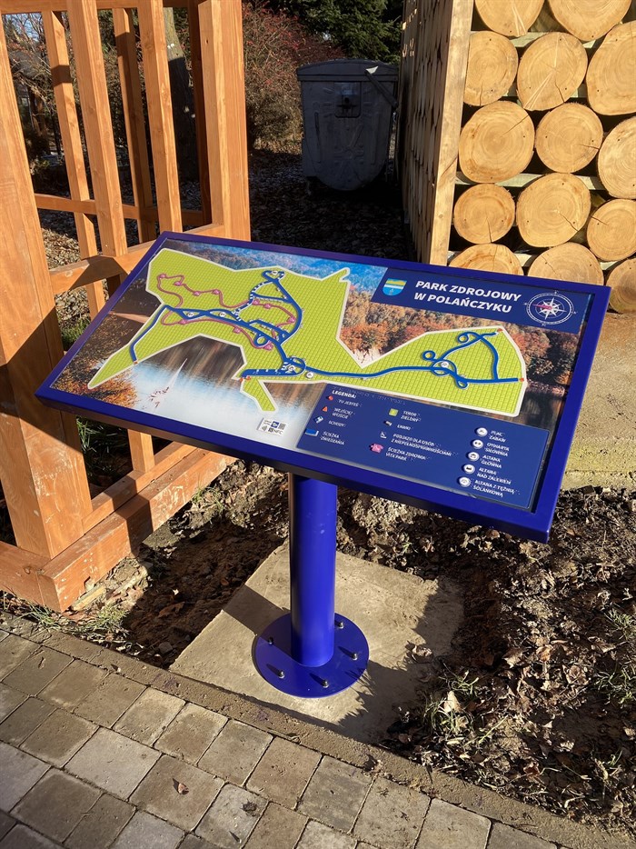 Duży, dotykowy plan informacyjny dokładnie opisuje topografię parku. Ma postać tablicy z tworzywa PMMA, umieszczonej na ergonomicznie pochylonym stojaku ze stali malowanej proszkowo na kolor kobaltowy. Plan utrzymany jest w żywej kolorystyce, korespondującej z naturalnym otoczeniem. Jego tło stanowi zdjęcie Jeziora Solińskiego z brzegami w jesiennej szacie. Na to tło nałożone są dotykowe elementy topografii parku w kolorach żółtym, niebieskim i różowym. Na tablicy znajduje się dotykowa legenda w czarnym druku i w brajlu, a także wspomniane już znaczniki. Całość charakteryzuje się niezwykłą estetyką.