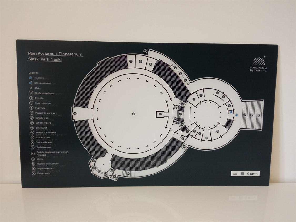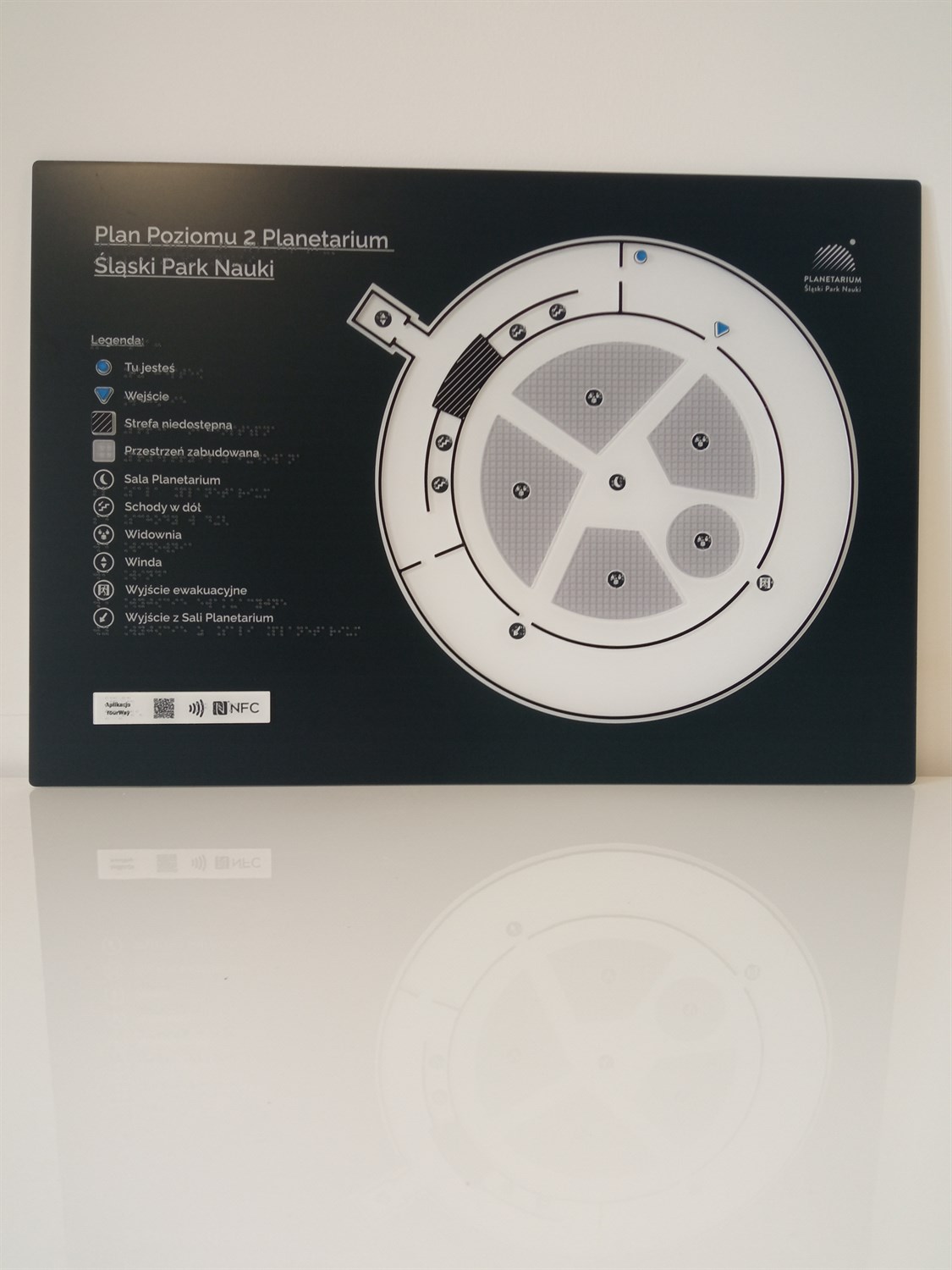 Realizacja w Planetarium Śląskiego Parku Nauki w Chorzowie trzy dotykowe plany informacyjne ze znacznikami NFC i 27 przezroczystych tablic informacyjnych z brajlem. Dotykowe plany informacyjne obiektu mają postać tablic z wytrzymałego tworzywa PMMA. Są utrzymane w biało-czarno-szarej kolorystyce. Dotykowe plany informacyjne obiektu mają postać tablic z wytrzymałego tworzywa PMMA, opisują topografię poziomów Planetarium. Są utrzymane w biało-czarno-szarej kolorystyce. Zostały opatrzone legendami w czarnym druku i w brajlu, a także znacznikami NFC. Gwoli przypomnienia - znaczniki NFC nie są wykrywane w przestrzeni. Odczytuje się je zbliżeniowo, przykładając telefon do znacznika. Znaczniki nie są na razie kompatybilne z aplikacją YourWay. Całości realizacji dopełniają przezroczyste tablice informacyjne w brajlu.