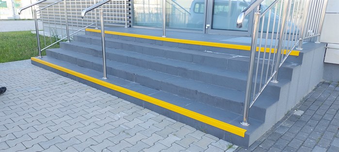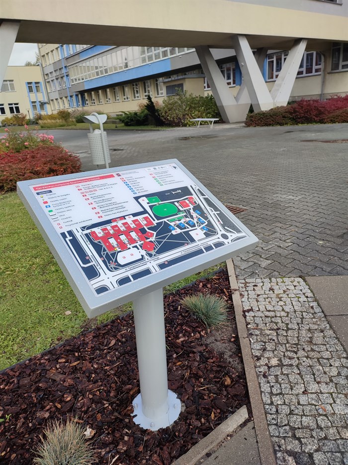 Dotykowy plan informacyjny usytuowany jest na zewnątrz obiektu. Ma postać tablicy z tworzywa PMMA umieszczonej na ergonomicznie pochylonym stojaku ze stali malowanej proszkowo na kolor jasnoszary. Wielobarwny plan zawiera legendę w czarnym druku i w brajlu, a także wspomniane znaczniki YourWay Beacon i NFC. Brajlowskie tabliczki informacyjne wykonane są z aluminium. Oznakowują poręcze schodów, zawierają napisy w brajlu i w czarnym druku. W newralgicznych punktach obiektu, m.in. nad wejściami, znajdują się znaczniki YourWay Plus. Krawędzie schodów zostały oznaczone kontrastową taśmą antypoślizgową w kolorze żółtym lub kątownikami w kolorze grafitowym.
