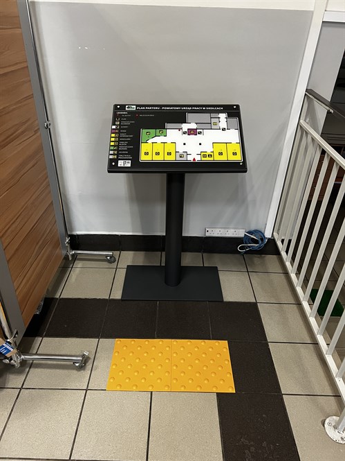 W Powiatowym Urzędzie Pracy w Siedlcach wykonano 5 dotykowych planów informacyjnych ze znacznikami YourWay Beacon i NFC, 32 metalowe tabliczki informacyjne w brajlu, 2 tabliczki informacyjne w czarnym druku i w brajlu, a także pola uwagi przed planami informacyjnymi.