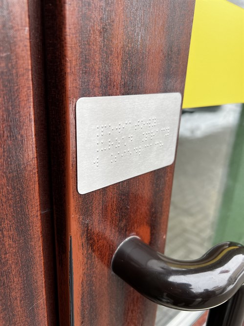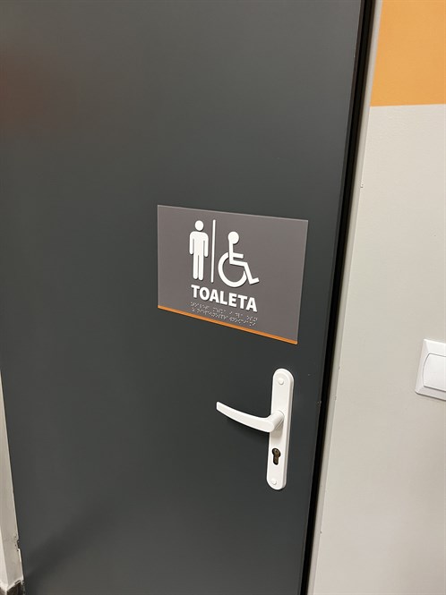 Przestrzeń opisują ponadto metalowe tabliczki informacyjne w brajlu umieszczone na drzwiach lub obok nich. Całości realizacji dopełniają dwie tabliczki informacyjne wykonane z tworzywa PMMA. Znajdują się na nich napisy w czarnym druku i w brajlu, a także piktogramy.