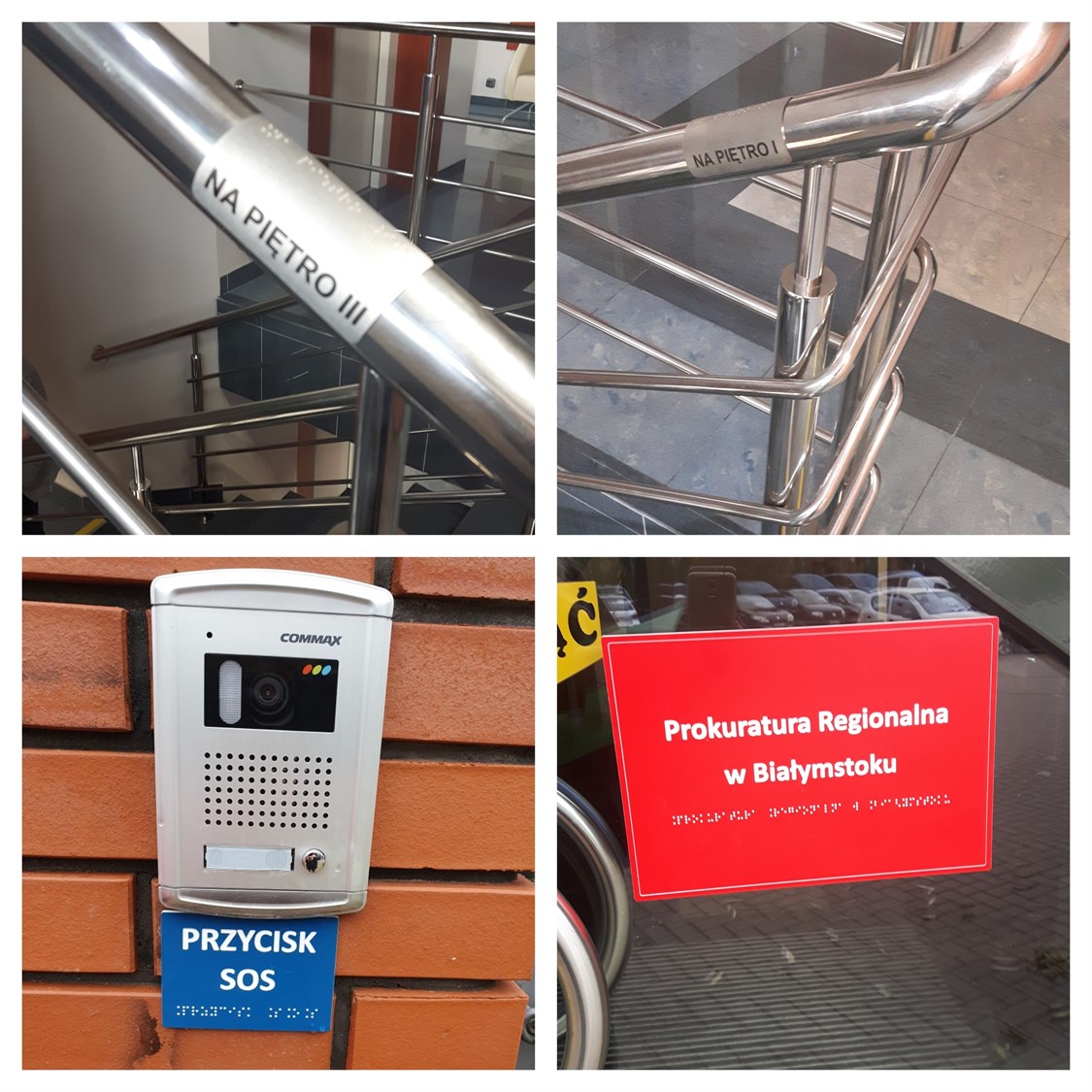 W ramach realizacji w budynku Prokuratury Regionalnej w Białymstoku wykonano tabliczki informacyjne z PMMA na drzwi i ściany w czarnym druku i w brajlu, metalowe tabliczki informacyjne w czarnym druku i w brajlu na poręcze schodów, a także oznakowanie schodów kontrastową taśmą w kolorze żółtym.