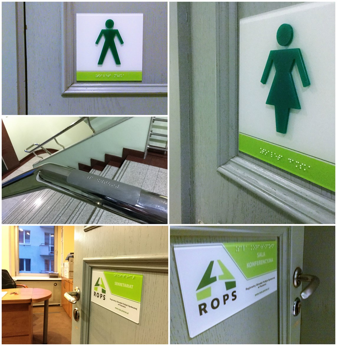 Realizacja obejmuje tabliczki informacyjne na drzwi i brajlowskie tabliczki na poręcze w budynku Regionalnego Ośrodka Pomocy Społecznej w Poznaniu. Tabliczki w biało-zielono-czarnej kolorystyce znajdują się na drzwiach gabinetów istotnych z punktu widzenia klienta, a także na drzwiach toalet. Zawierają piktogramy i napisy w czarnym druku i w brajlu. W skład realizacji wchodzą ponadto brajlowskie tabliczki na poręcze.