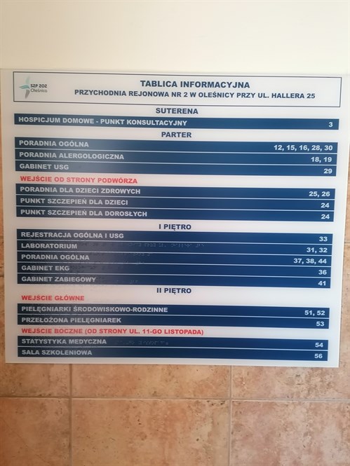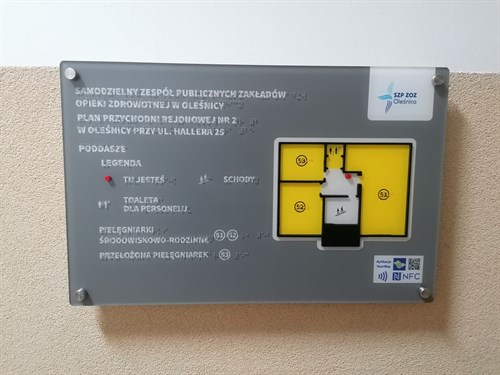Realizacja tyflograficzna w SPZOZ Oleśnica została wykonana w czterech placówkach zespołu – w dwóch przychodniach w Oleśnicy, a także w przychodniach w Ligocie Polskiej i w Boguszycach. W skład realizacji wchodzą dotykowe plany informacyjne ze znacznikami YourWay Plus i NFC, pętle indukcyjne dla osób słabosłyszących, brajlowskie i czarnodrukowe tablice i tabliczki informacyjne na ściany i drzwi, brajlowskie nakładki na poręcze schodów, linie naprowadzające i pola uwagi. Dotykowe plany informacyjne mają postać tablic utrzymanych w pastelowej kolorystyce – błękit, biel, szarość, żółty i dodatek czerni. Plany opatrzone są legendami w czarnym druku i w brajlu. Część tablic usytuowano na ergonomicznie pochylonych stojakach ze stali malowanej proszkowo, część znajduje się na ścianach, na dystansach, w pionie. Tablice i tabliczki informacyjne w czarnym druku i w brajlu umieszczono na ścianach lub na drzwiach. Utrzymane są w biało-niebieskiej kolorystyce. Dopełnieniem realizacji są pętle indukcyjne wzmacniające dźwięk i ułatwiające komunikację z osobami niedosłyszącymi. Przychodnie zostały ponadto wyposażone w kontrastowe linie naprowadzające i pola uwagi. Wszystkie te elementy są w ostrym kolorze żółtym.