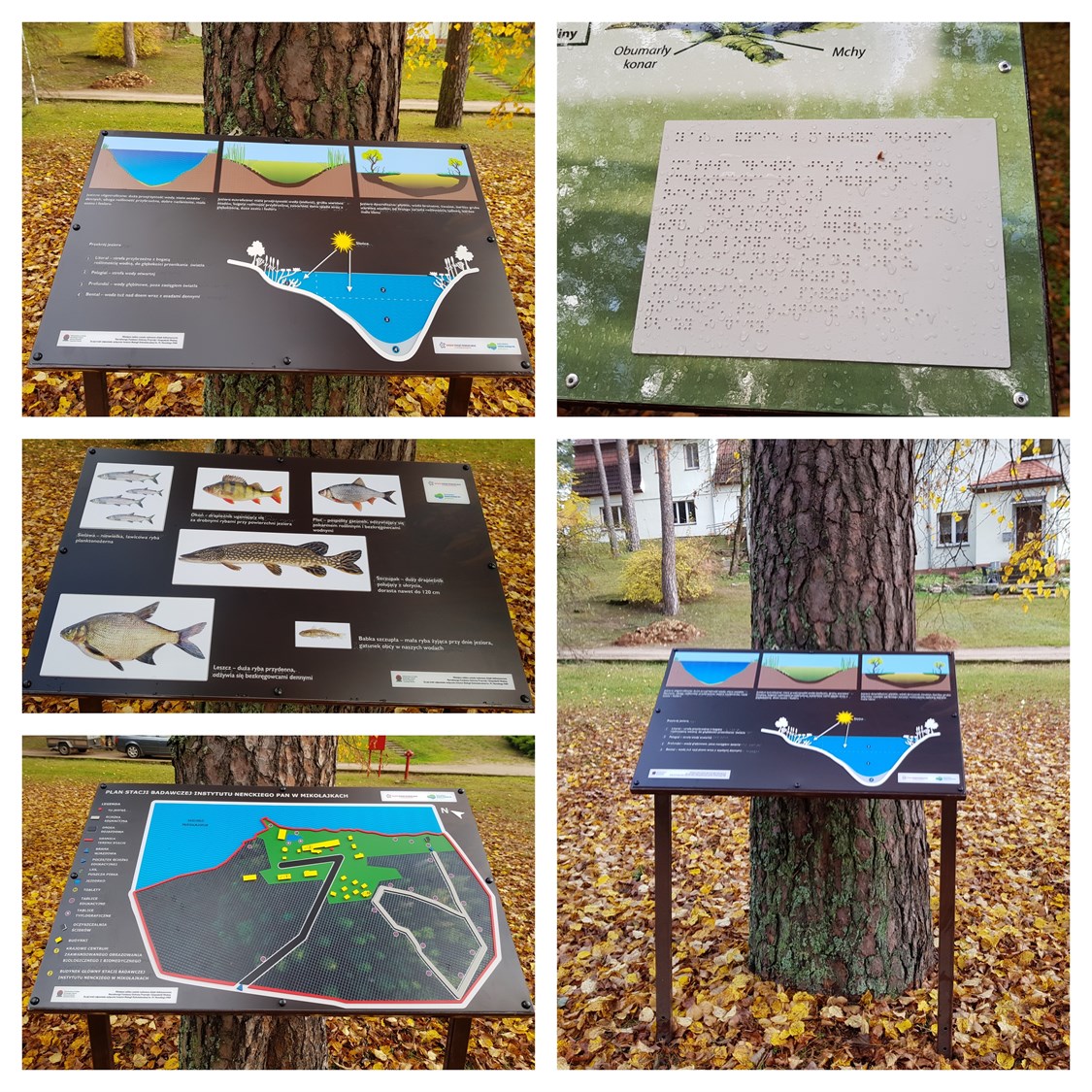 Dotykowy plan informacyjny Stacji Badawczej Instytutu Nenckiego PAN w Mikołajkach ma postać wielobarwnej tablicy w żywych kolorach, komponujących się z otaczającą przyrodą, wykonanej w całości z tworzywa PMMA, zwanego szkłem organicznym, odpornego na warunki atmosferyczne, zadrapania i uszkodzenia. Tablica ułożona jest poziomo i została ergonomicznie pochylona w kierunku osoby ją oglądającej. Znajduje się na stojaku ze stali malowanej proszkowo. Wypukły plan informacyjny usytuowany jest w prawej i centralnej części tablicy. W jej lewej części widoczna jest czarnodrukowa i brajlowska legenda. Tablica wyposażona została w beacon, micro nadajnik, który po skomunikowaniu się z aplikacją YourWay w smartfonie zwiedzającego, informuje o miejscu, w którym ten się znajduje. Realizacja obejmuje ponadto wypukłą, wielobarwną, informacyjną tablicę PMMA, dotyczącą ekosystemu jeziora. Górne, wypukłe ryciny niecki jeziora zostały wykonane w technice termoformowania, dolna rycina niecki jeziora, także wypukła i dotykowa, powstała w technologii nakładania warstw tworzywa PMMA. Tablica została opisana w czarnym druku i w brajlu, jest umieszczona poziomo, na stojaku ze stali malowanej proszkowo i została ergonomicznie pochylona w kierunku osoby ją oglądającej. Kolejnym obiektem wchodzącym w skład realizacji jest wypukła, dotykowa tablica informująca o gatunkach ryb zasiedlających jezioro. Wykonana jest w technice termoformowania, została opisana w czarnym druku i w brajlu. Znajduje się na stojaku ze stali malowanej proszkowo, usytuowana jest poziomo z pochyleniem w kierunku osoby ją oglądającej. Realizacja obejmuje też dwadzieścia transparentnych tabliczek PMMA w formacie A5, z brajlowskimi opisami, zamontowanych na tablicach informacyjnych przygotowanych przez innego wykonawcę.
