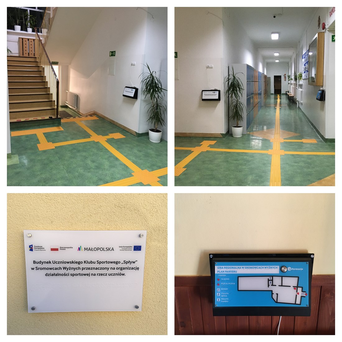Realizacja w budynku szkoły podstawowej i uczniowskiego klubu „Spływ” w Sromowcach Wyżnych obejmuje udźwiękowione terminale informacyjne z planami i z brajlowskimi napisami, tablicę informacyjną na ścianie zewnętrznej obiektu, ścieżki naprowadzające i nakładki na poręcze schodów. W skład realizacji wchodzi ponadto pięć sztuk elektronicznych publikatorów dla osób niesłyszących. Ergonomicznie pochylone dla wygody uczniów terminale informacyjne zostały umieszczone na ścianach, wewnątrz budynku. Utrzymane są w biało-niebieskiej kolorystyce z czarnymi i czerwonymi elementami. Tablica informacyjna na zewnętrznej ścianie budynku zawiera czarnodrukowy poddruk i napisy w brajlu. Wyraźne ścieżki naprowadzające są koloru żółtego.