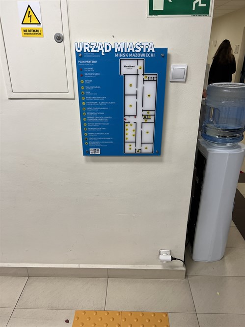 Realizacja w Urzędzie Miejskim Mińsk Mazowiecki obejmuje wykonanie dotykowego planu informacyjnego ze znacznikiem YourWay Beacon i NFC, a także montaż pola uwagi. Dotykowy plan informacyjny w formie niebiesko-czarno-białej tablicy z tworzywa PMMA z drobnymi elementami w kolorach żółtym i czerwonym został opatrzony legendą w czarnym druku i w brajlu, i umieszczony na ścianie, w pionie, na dystansach, a także wyposażony we wspomniane wyżej znaczniki. Tuż przed planem znajduje się kontrastowe pole uwagi w kolorze żółtym.