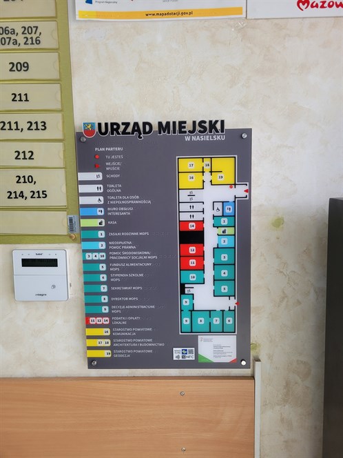 W budynku Urzędu Miasta Nasielsk została w wykonana realizacja tyflograficzna obejmująca trzy dotykowe plany informacyjne wyposażone w znaczniki YourWay Beacon i NFC, 55 brajlowskich, aluminiowych tabliczek informacyjnych, tabliczkę informacyjną z grawerem i brajlem na drzwi wejściowe, linie naprowadzające i pola uwagi, pasy ostrzegawcze na krawędzie schodów. Dotykowe plany informacyjne mają postać wielobarwnych tablic z tworzywa PMMA i opatrzone są legendami w brajlu, i czarnym druku, a także wyposażone we wspomniane już znaczniki komunikujące się z aplikacją YourWay na smartfonie osoby odwiedzającej urząd. Wszystkie plany zostały umieszczone w pionie, na ścianach, na dystansach. Brajlowskie, aluminiowe tabliczki informacyjne zamontowane są na drzwiach. Linie naprowadzające i pola uwagi mają kontrastową, żółtą barwę. Żółte są też pasy ostrzegawcze na krawędziach schodów. Tabliczka informacyjna na drzwi wejściowe z grawerem, czarnym drukiem i brajlem jest barwy czerwonej.