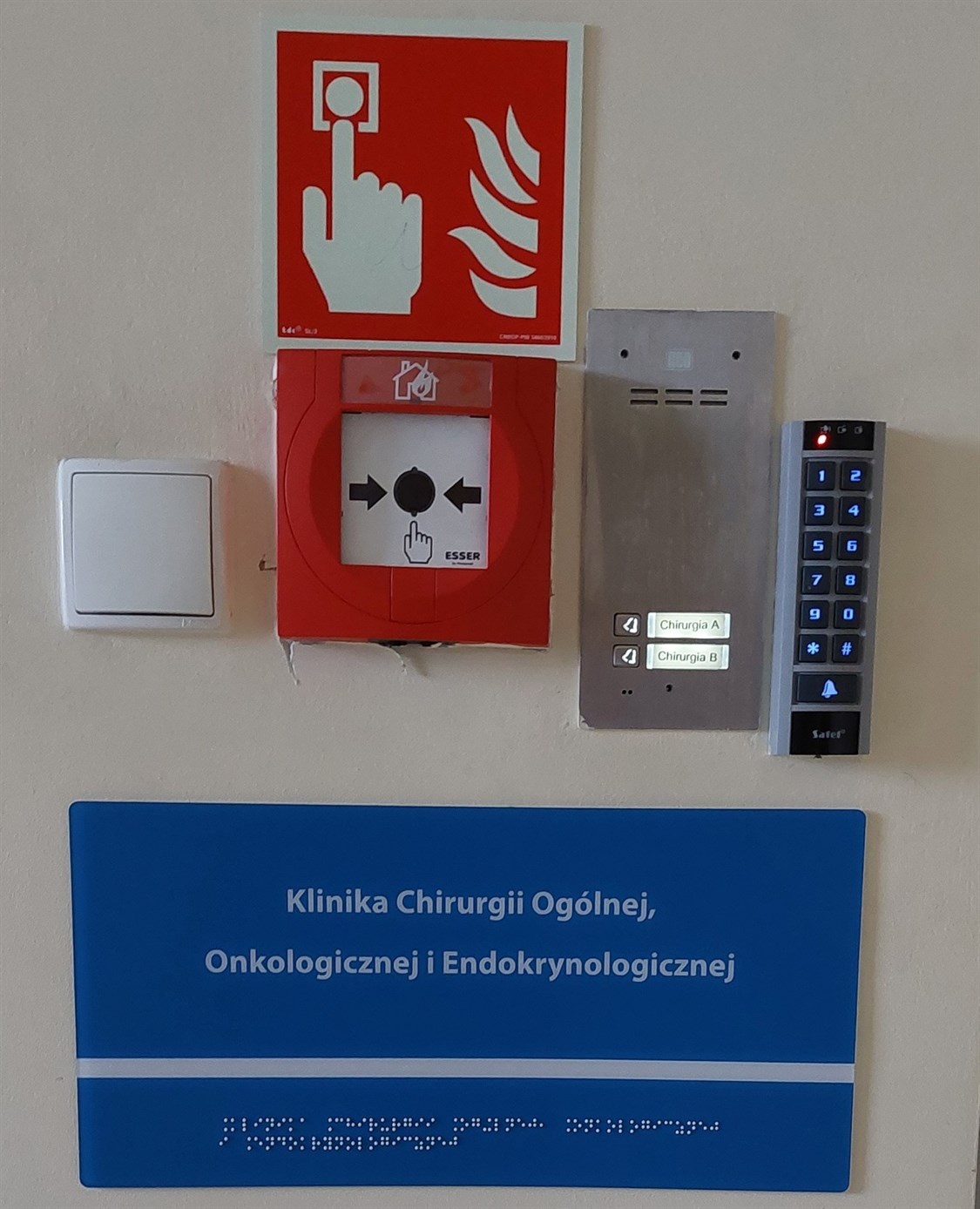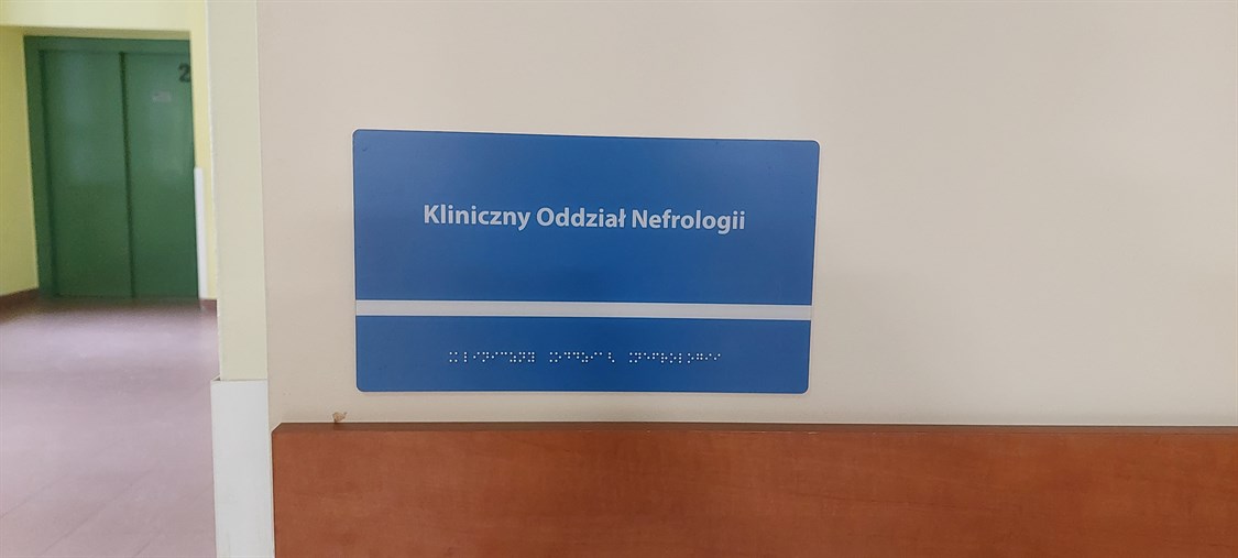 W Wojewódzkim Szpitalu Zespolonym w Kielcach wykonano tabliczki informacyjne z tworzywa PMMA z napisami w czarnym druku i w brajlu. Wszystkie tabliczki są w kolorze niebieskim, ich liternictwo jest białe. Część czarnodrukową, znajdującą się na górze, od części brajlowskiej usytuowanej na dole, oddziela biały pas, biegnący przez całą szerokość tabliczki. Tabliczki zostały umieszczone na drzwiach poszczególnych klinik, oddziałów, zakładów i laboratoriów szpitala.