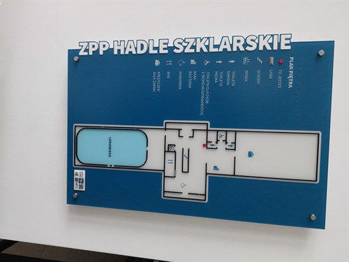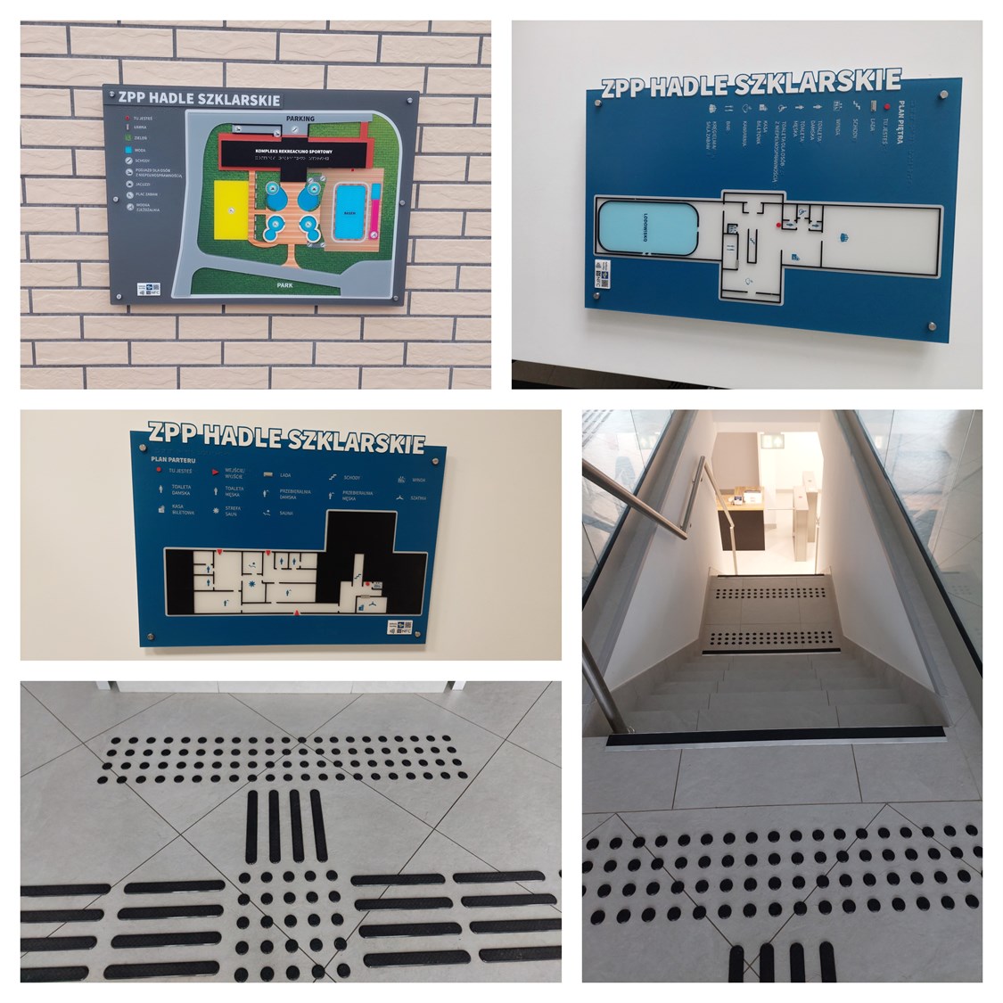 Realizacja w Zespole Pałacowo – Parkowym w Hadlach Szklarskich obejmuje 3 dotykowe plany informacyjne z tworzywa PMMA ze znacznikami YourWay Beacon i NFC, tabliczki informacyjne z tego samego tworzywa z napisami w brajlu i z piktogramami, metalowe tabliczki informacyjne na poręcze schodów, oznakowanie stopni schodów, a także linie naprowadzające i pola uwagi przed schodami. Plany informacyjne mają postać wielobarwnych, dotykowych tablic, opatrzonych legendami w czarnym druku i w brajlu. Zostały umieszczone w pionie, na ścianach, na dystansach. Posiadają znaczniki YourWay Beacon i NFC. W ramach realizacji wykonano ponadto tabliczki informacyjne z napisami w brajlu i z piktogramami, a także metalowe tabliczki informacyjne na poręcze schodów. Stopnie schodów zostały oznakowane, wiodą do nich ponadto ścieżki naprowadzające. Przed schodami znajdują się pola uwagi.
