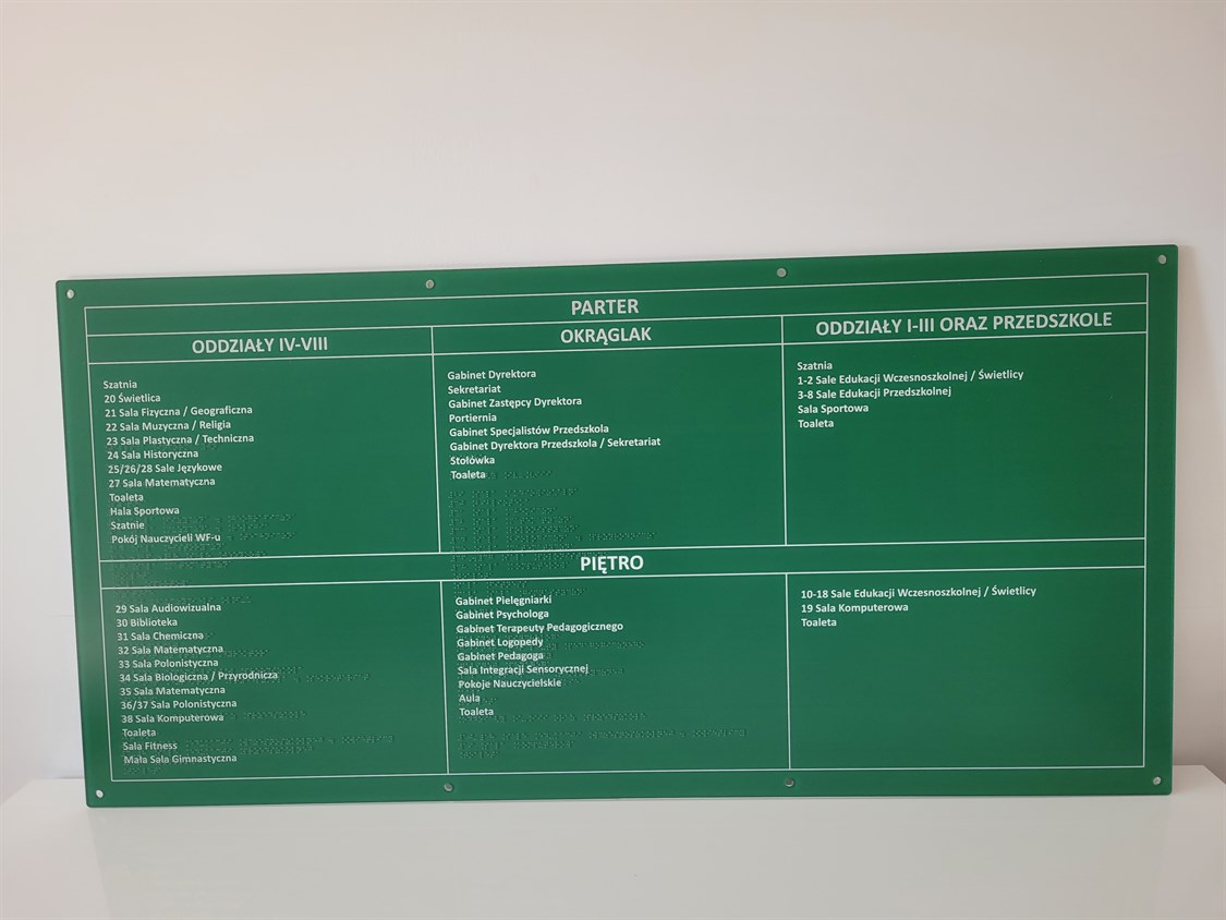 Dla Zespołu Szkolno-Przedszkolnego im. Marii Skłodowskiej-Curie w Ruścu wykonano tablicę informacyjną w czarnym druku i w brajlu. Zielona tablica z tworzywa PMMA, z białym liternictwem, jest przeznaczona do powieszenia w pionie, na ścianie.
