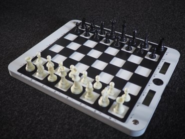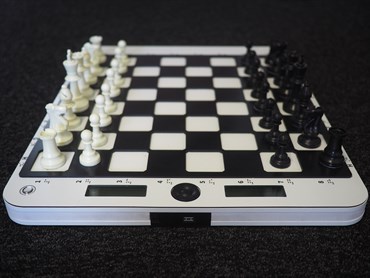 A chess game is played on a typical 400 x 400 mm chessboard with fields measuring 50 x 50 mm. A computer is mounted under the chessboard. The fields of the chessboard are surrounded by an additional space 60 mm wide, on the upper surface of which are arranged the controls that function when the chess board is connected to the power supply and used as an electronic device. On the side of each player are buttons for confirming moves. On the other hand, the navigation buttons - up, down, left, right and the OK button - are located between the side edge of the chess board and the H4 and H5 boxes. These buttons are used to navigate through the menu and to change settings. On the same edge of the chess board, on each player's side, the chess clock displays have been placed.
