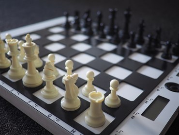 The chessboard fields and chess pieces have features that allow them to be distinguished by sight, touch and electronically.