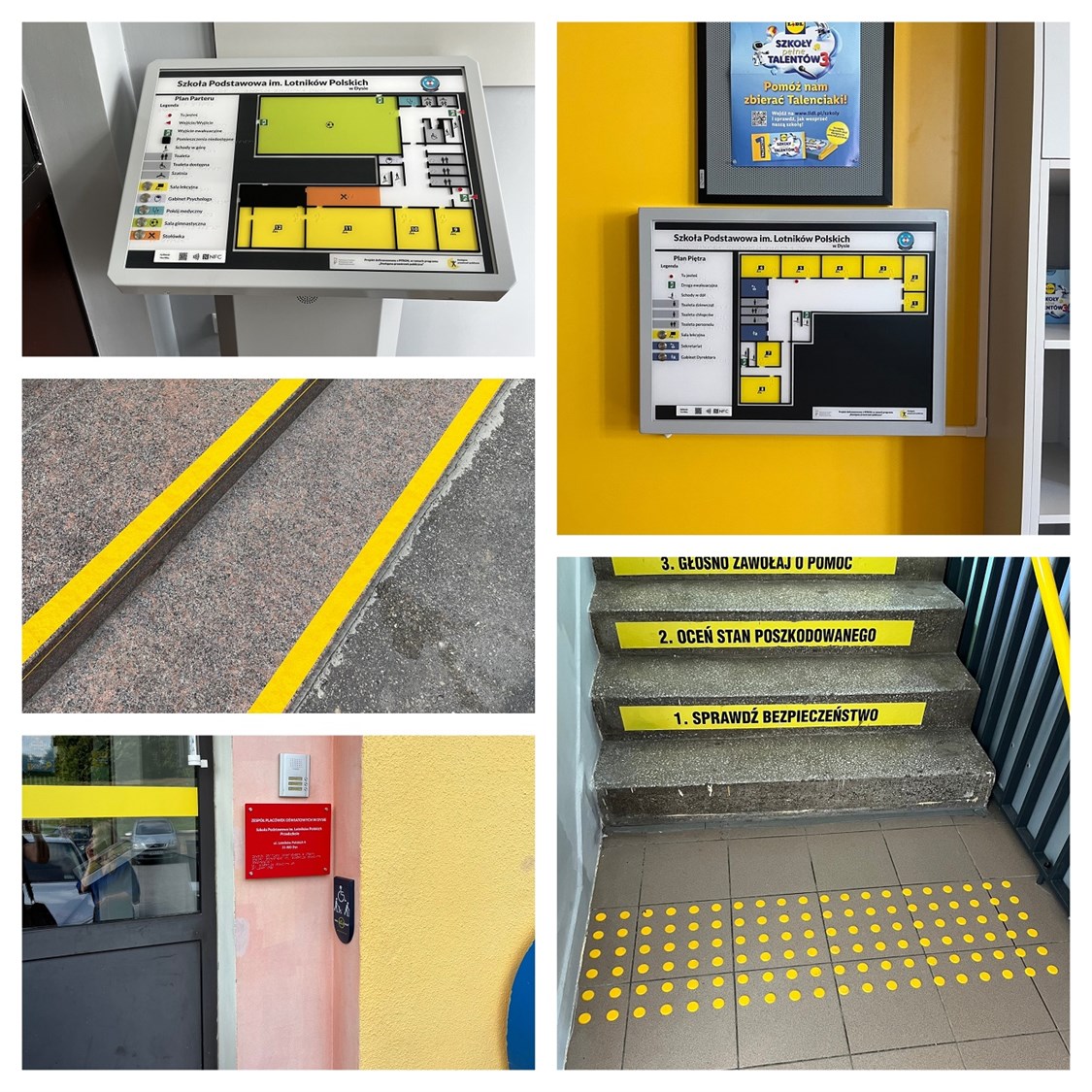 Tyflograficzny plan informacyjny ze znacznikami YourWay Beacon i NFC, tabliczki informacyjne w czarnym druku i w brajlu, krzesło ewakuacyjne.