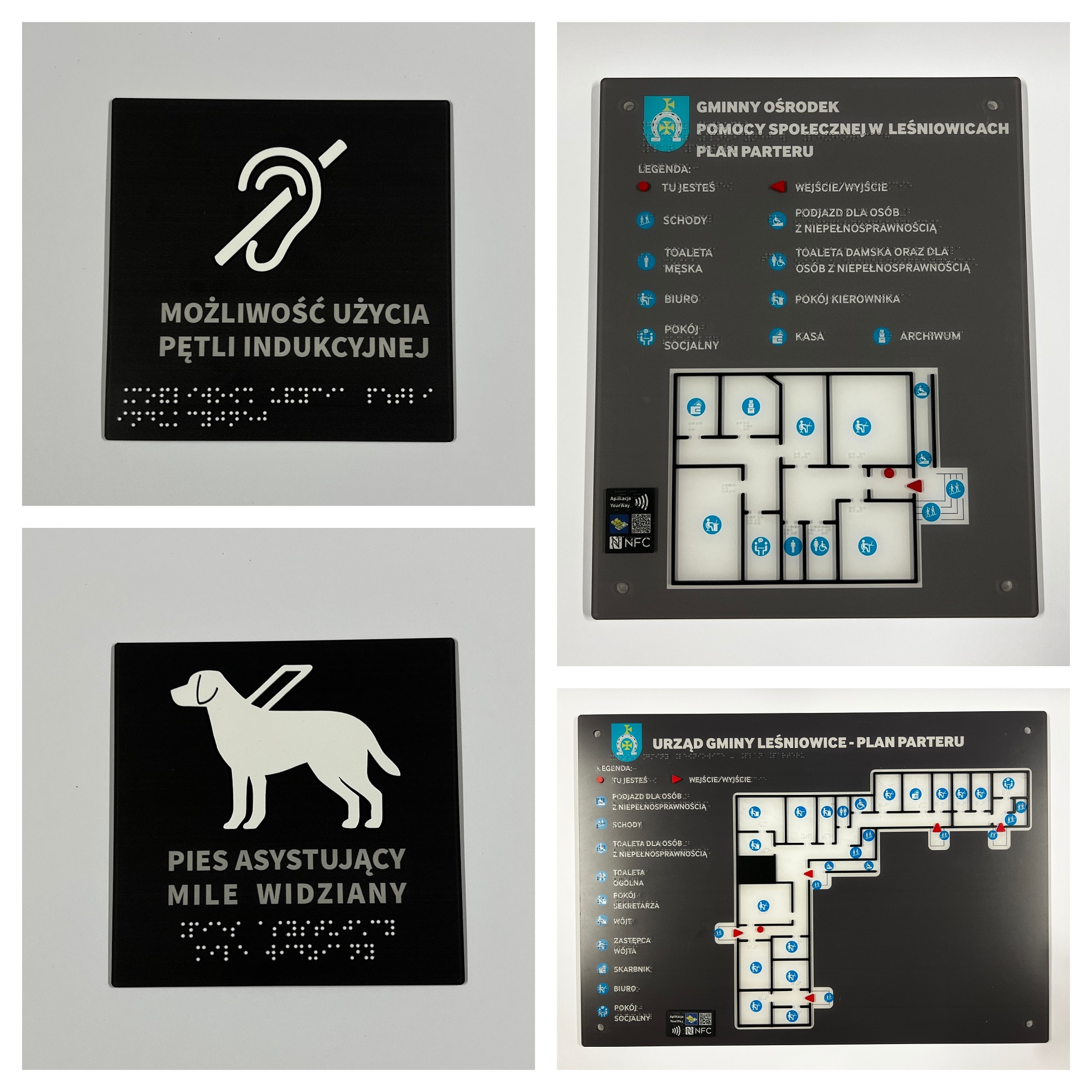 Dla wszystkich lokalizacji wykonane zostały ponadto tabliczki informacyjne w kolorze grafitowym z tworzywa PMMA, z białymi napisami w czarnym druku i w brajlu, opatrzone dodatkowo piktogramami. Przykładowe napisy na tabliczkach to: Pies asystujący mile widziany, Możliwość użycia pętli indukcyjnej, Podjazd przy budynku.