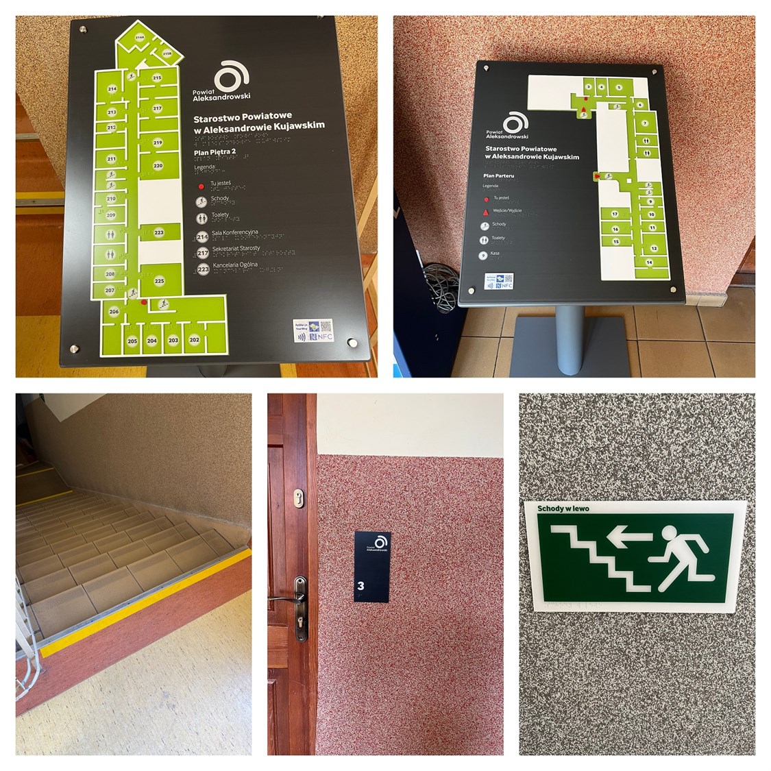 Pracownicy Altixu wykonywali kolejną z licznych realizacji tyflograficznych, tym razem w budynku Starostwa Powiatowego w Aleksandrowie Kujawskim. Obejmowała ona m.in. dwa dotykowe plany informacyjne parteru i piętra budynku, usytuowane na ergonomicznie pochylonych stojakach ze stali malowanej proszkowo na kolor grafitowy. Tablice z planami wykonane zostały z wytrzymałego tworzywa PMMA w szaro-czarno-biało-zielonej kolorystyce, z detalami w kolorze czerwonym. Plany zawierają wypukłe obiekty topografii budynku, legendy w czarnym druku i w brajlu oraz znaczniki YourWay Beacon i NFC.