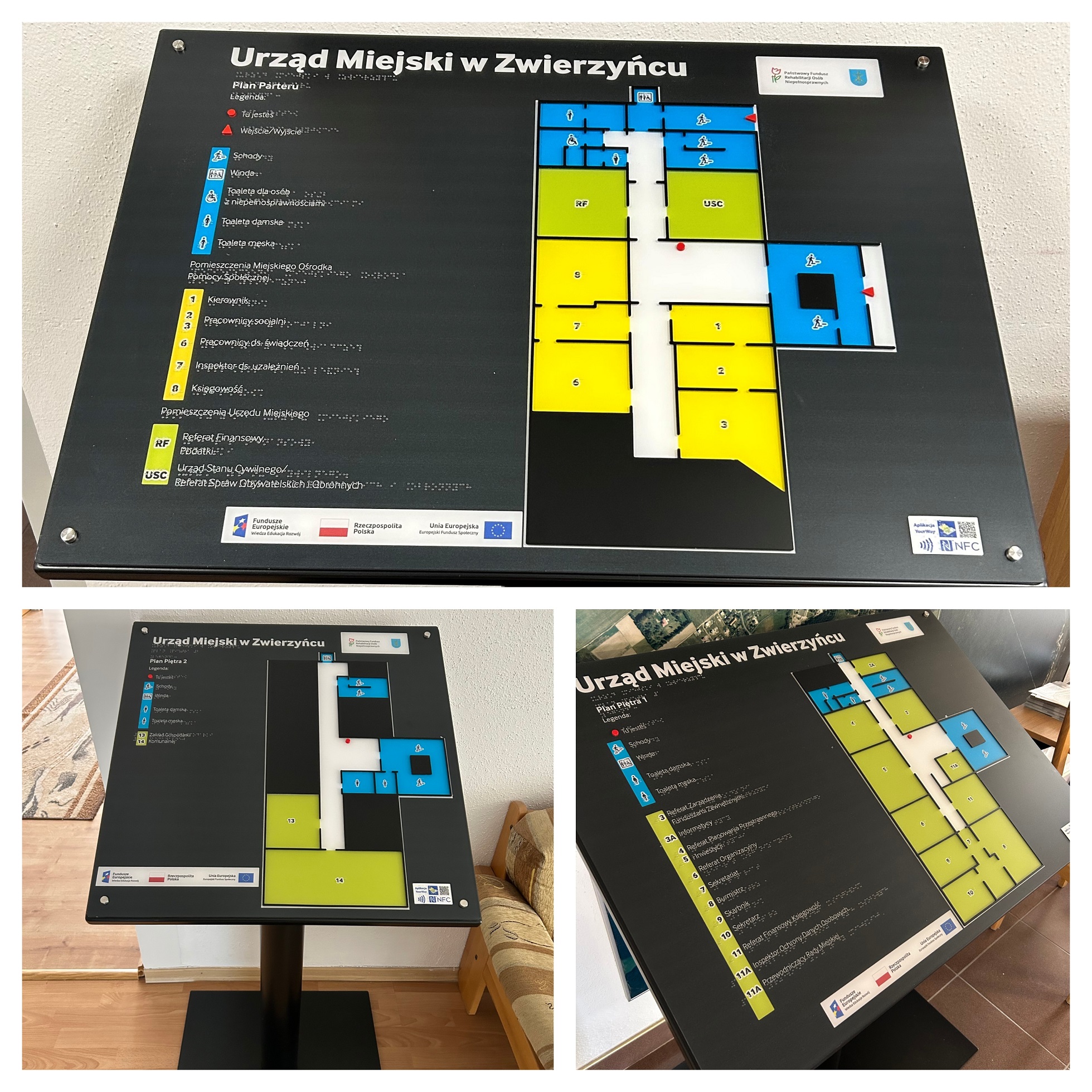 W budynku Urzędu Miejskiego w Zwierzyńcu pracownicy Altixu wykonali trzy dotykowe plany informacyjne ze znacznikami YourWay Beacon i NFC, tabliczki informacyjne na poręcze schodów, tabliczki informacyjne z pozłacanego laminatu z brajlem i grawerem, a także informacyjną tabliczkę na drzwi z godzinami otwarcia urzędu.
