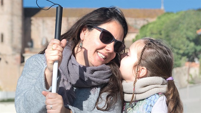 Tekst alternatywny: Młoda, niewidoma, uśmiechnięta mama z córką.