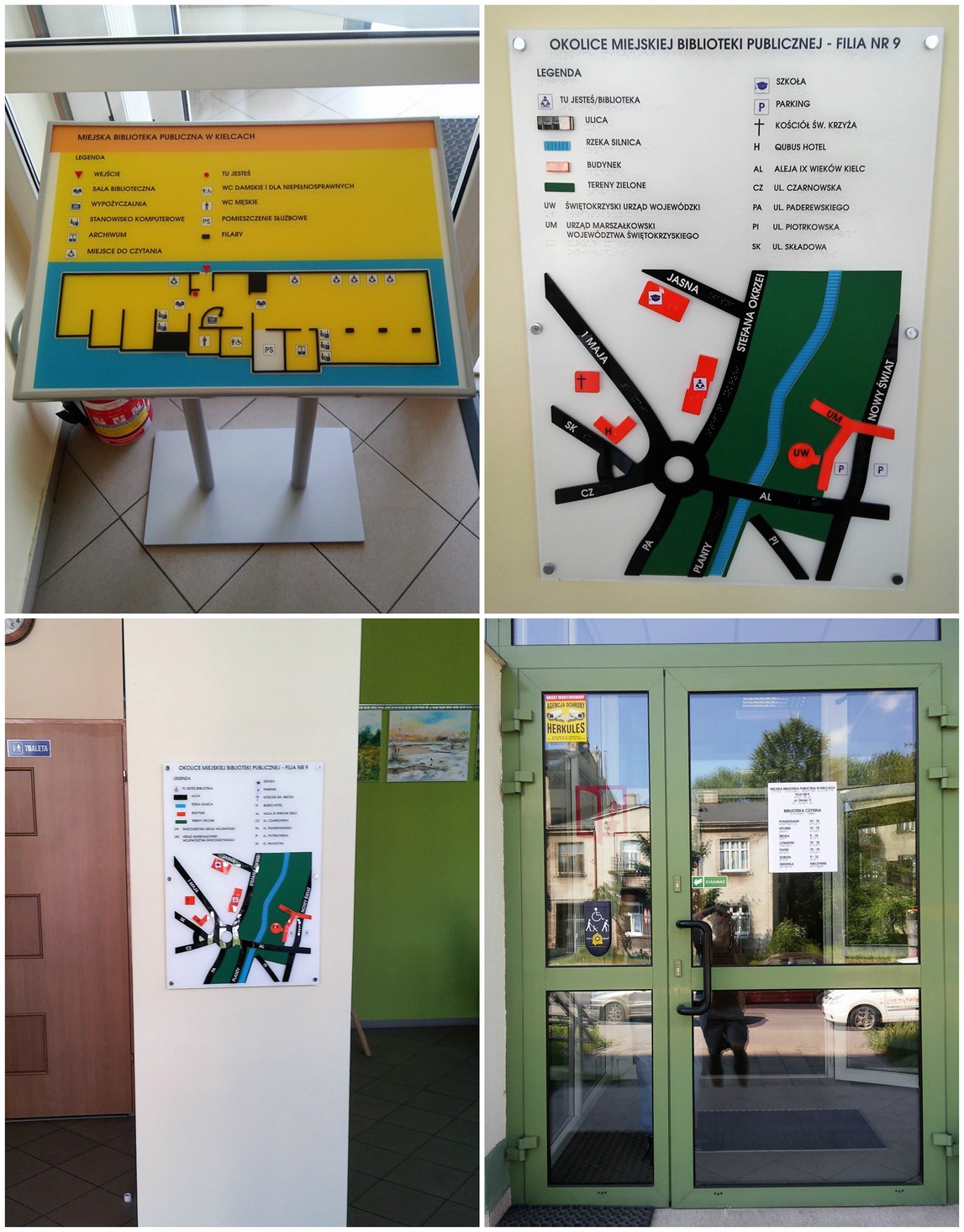 W budynku Miejskiej Biblioteki Publicznej w Kielcach zostały wykonane - dotykowy plan informacyjny, brajlowsko-czarnodrukowe tablice informacyjne i system Call-Hear. Dotykowy plan informacyjny wnętrza budynku biblioteki ma postać ergonomicznie pochylonej, kolorowej tablicy, usytuowanej na dwunożnym, stalowym stojaku, zamocowanym do stalowej płyty podłogowej. Plan znajduje się na dole tablicy, dotykowa legenda, opisana w czarnym druku i w brajlu, w jej górnej części. W skład realizacji wchodzą ponadto czarnodrukowo-brajlowskie tablice informacyjne z tworzywa. Jedna z nich umieszczona jest na ścianie, w pionie i zawiera dotykowy plan otoczenia biblioteki z brajlowską i czarnodrukową legendą. Druga znajduje się na drzwiach wejściowych placówki. Umieszczono na niej nazwę biblioteki i godziny jej otwarcia. Ostatnim elementem realizacji jest Call-Hear, system wzywania pomocy, przeznaczony dla osób niepełnosprawnych. Informuje, że w budynku lub przed wejściem do budynku znajduje się osoba potrzebująca asysty, np. osoba niewidoma. System ułatwia zatem dostęp do budynku każdemu, kto ma trudności w samodzielnym poruszaniu się. Ponadto zamontowany w newralgicznych miejscach budynku umożliwia błyskawiczną reakcję w sytuacjach nagłych i awaryjnych. System składa się z jednostki alarmującej - nadajnika, odbiornika wewnętrznego i opcjonalnie z klucza lub zestawu kluczy, które służą do aktywacji nadajnika. Jednostka alarmująca, bezprzewodowy nadajnik, montowany jest na zewnątrz budynku, najczęściej przy drzwiach wejściowych. Można go także zamontować w recepcji, w punkcie obsługi klienta, itp. Jednostka alarmująca, nadajnik, aktywowany jest po naciśnięciu przycisku, lub przy pomocy klucza, jeśli wybrano wersję urządzenia z kluczem. Po aktywowaniu nadajnik wysyła sygnał do odbiornika wewnętrznego. Może to być dźwięk, migające światła lub oba te sygnały na raz. Sygnały te stanowią informację dla recepcji lub punktu obsługi klienta, że przy wejściu czeka osoba potrzebująca pomocy.