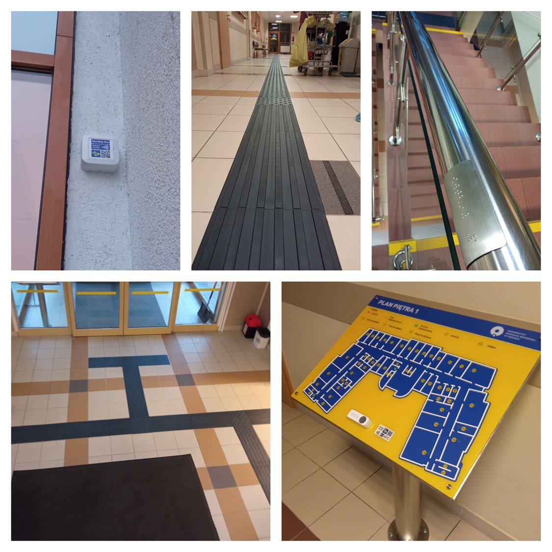 W skład realizacji na Wydziale Farmacji Collegium Medicum Uniwersytetu Mikołaja Kopernika w Bydgoszczy wchodzą dotykowe plany informacyjne ze znacznikami YourWay Plus i NFC, a także z systemem przywoławczym SOS, usytuowane na każdej kondygnacji obiektu, brajlowskie tabliczki informacyjne na poręcze, linie naprowadzające i pola uwagi, a także kontrastowe oznakowanie schodów. Dotykowe plany informacyjne mają postać niebiesko-żółto-białych tablic, wyposażonych w legendy opatrzone czarnodrukowymi i brajlowskimi napisami. Wykonane są w całości z tworzywa PMMA i usytuowane na stojakach z chromowanej stali, z ergonomicznym pochyleniem ku osobie oglądającej. Prezentują plany w perspektywie zależnej od tego, gdzie zostały umieszczone. Są wyposażone w znaczniki YourWay Plus i NFC, a także w system przywoławczy SOS. Realizacja obejmuje ponadto metalowe tabliczki informacyjne na poręcze schodów, w estetyczne, barwy grafitowej, linie naprowadzające i pola uwagi, a także oznakowanie schodów, żółtą, kontrastową taśmą.
