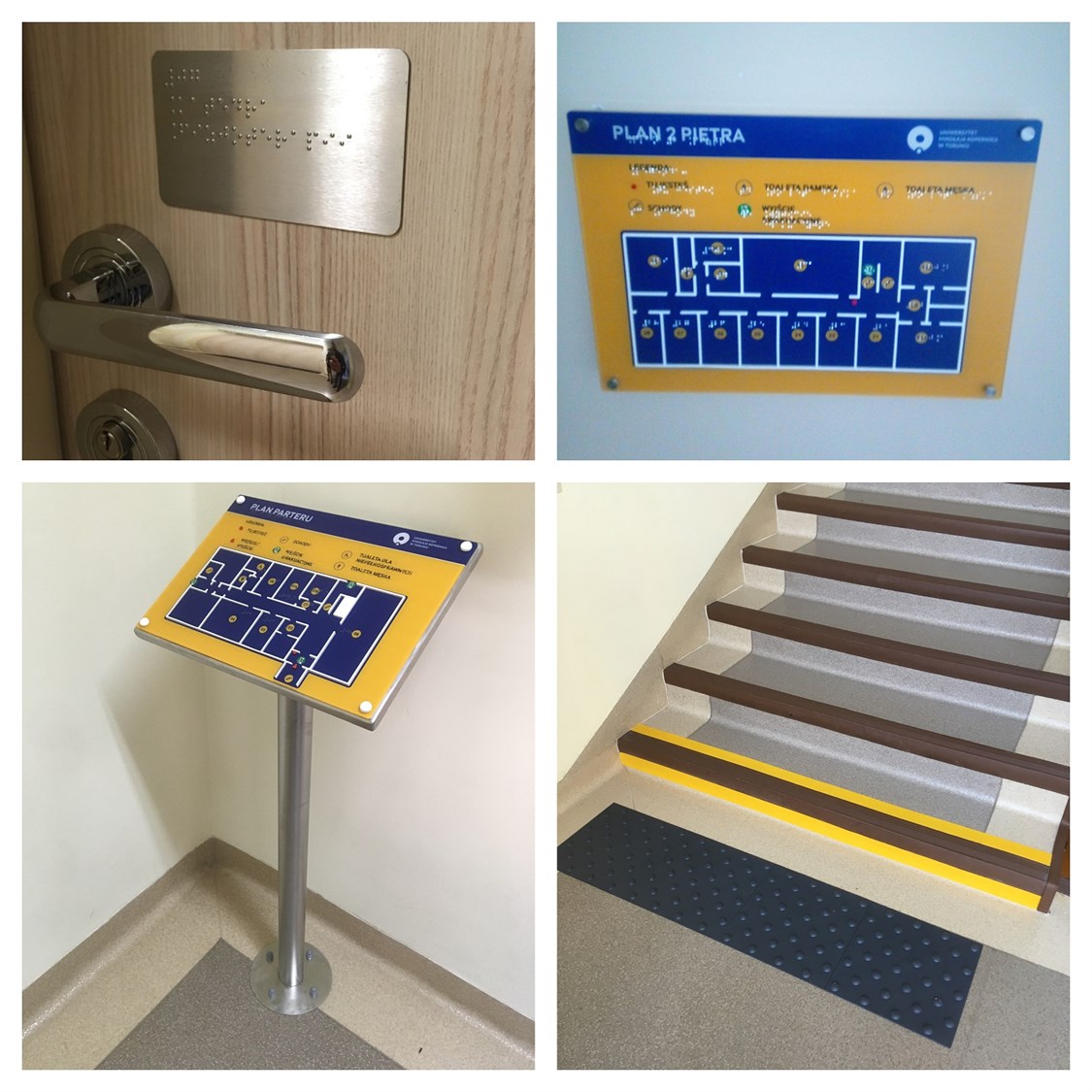 Cztery dotykowe plany informacyjne w siedzibie Collegium Medicum Uniwersytetu Mikołaja Kopernika w Bydgoszczy mają postać niebiesko-żółto-białych tablic z czarnodrukowymi i brajlowskimi napisami. Wykonane są w całości z tworzywa PMMA, zwanego szkłem organicznym. Jest ono odporne na warunki atmosferyczne, zadrapania i uszkodzenia. Trzy z tablic umieszczone są na ścianach, pionowo, na dystansach, zaś jeden poziomo, na stojaku z chromowanej stali, z ergonomicznym pochyleniem ku osobie oglądającej. Prezentują plany w perspektywie zależnej od tego, gdzie zostały umieszczone. Plany informacyjne usytuowane są centralnie, w środkowej i dolnej części tablicy, zaś legenda znajduje się w jej górnej części, nad planem. Ścienne plany informacyjne piwnicy, pierwszego piętra i drugiego piętra zostały wyposażone w beacony, które po skomunikowaniu się z aplikacją YourWay w smartfonie odwiedzającego obiekt, informują o miejscu, w którym ten się znajduje. Plan parteru wyposażono w nadajnik YourWay Plus. Cztery kolejne nadajniki YourWay Plus znajdują się na klatkach schodowych na każdym z pięter, a więc na poziomie piwnicy, parteru, piętra pierwszego i drugiego. Nadajniki mają postać niewielkich pudełek i posiadają głośnik, za pomocą którego sygnalizowana jest ich obecność. Może się to odbywać automatycznie, gdy w pobliżu znajdzie się urządzenie mobilne z aplikacją YourWay lub na życzenie użytkownika, który otrzymuje ponadto szerszą, opisową, głosową informację na temat miejsca, w którym znajduje się nadajnik. Urządzenie jest obsługiwane smartfonem za pośrednictwem aplikacji YourWay. W skład realizacji wchodzą ponadto 52 nadklamkowe, metalowe tabliczki na drzwi z napisami w brajlu, a także taśmy ostrzegawcze na pierwszy i ostatni stopień schodów, i pola ostrzegawcze z poliuretanu, z wypukłymi elementami wewnątrz budynku i na zewnątrz, przed wejściem do obiektu.