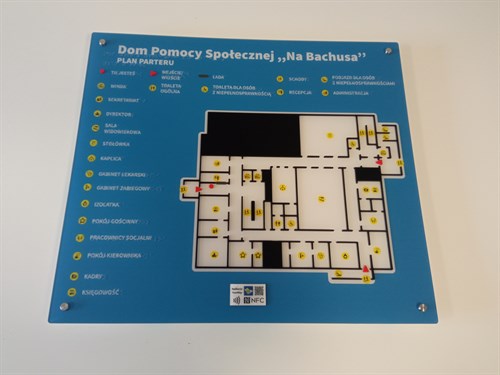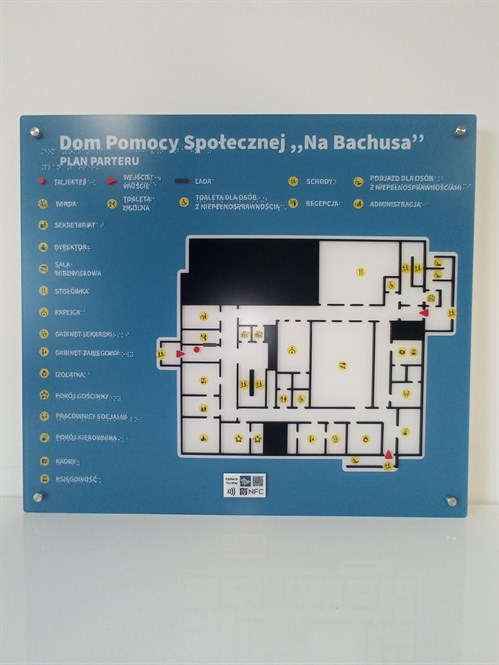 Realizacja tyflograficzna w Domu Pomocy Społecznej „Na Bachusa” w Warszawie obejmuje wykonanie dotykowego planu informacyjnego ze znacznikami YourWay Beacon i NFC, a także wykonanie pola uwagi przed planem. Plan w formie tablicy z wytrzymałego tworzywa PMMA został zainstalowany na ścianie, w pionie, na dystansach. Na niebieskim tle, z lewej strony, znajduje się legenda w czarnym druku i w brajlu. Jej liternictwo jest białe. Z prawej strony tablicy usytuowany jest biało-czarny plan parteru placówki z drobnymi elementami w kolorze żółtym i czerwonym. Plan wyposażony jest we wspomniane już znaczniki. Przed nim znajduje się pole uwagi.
