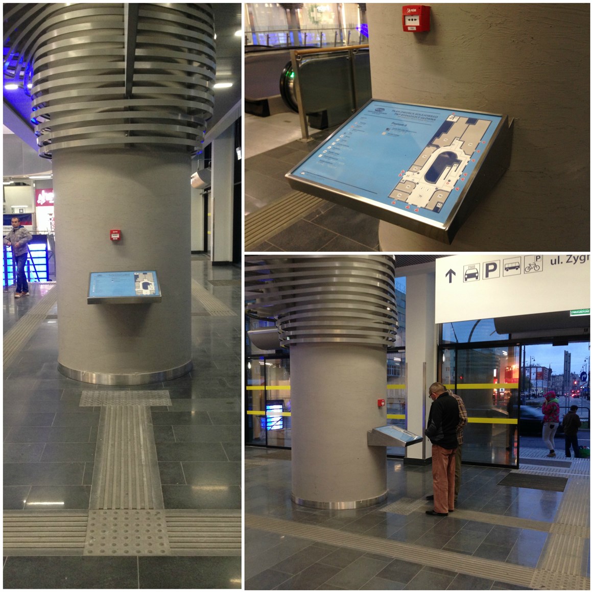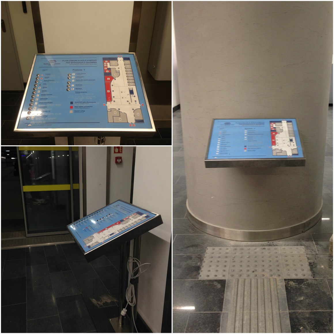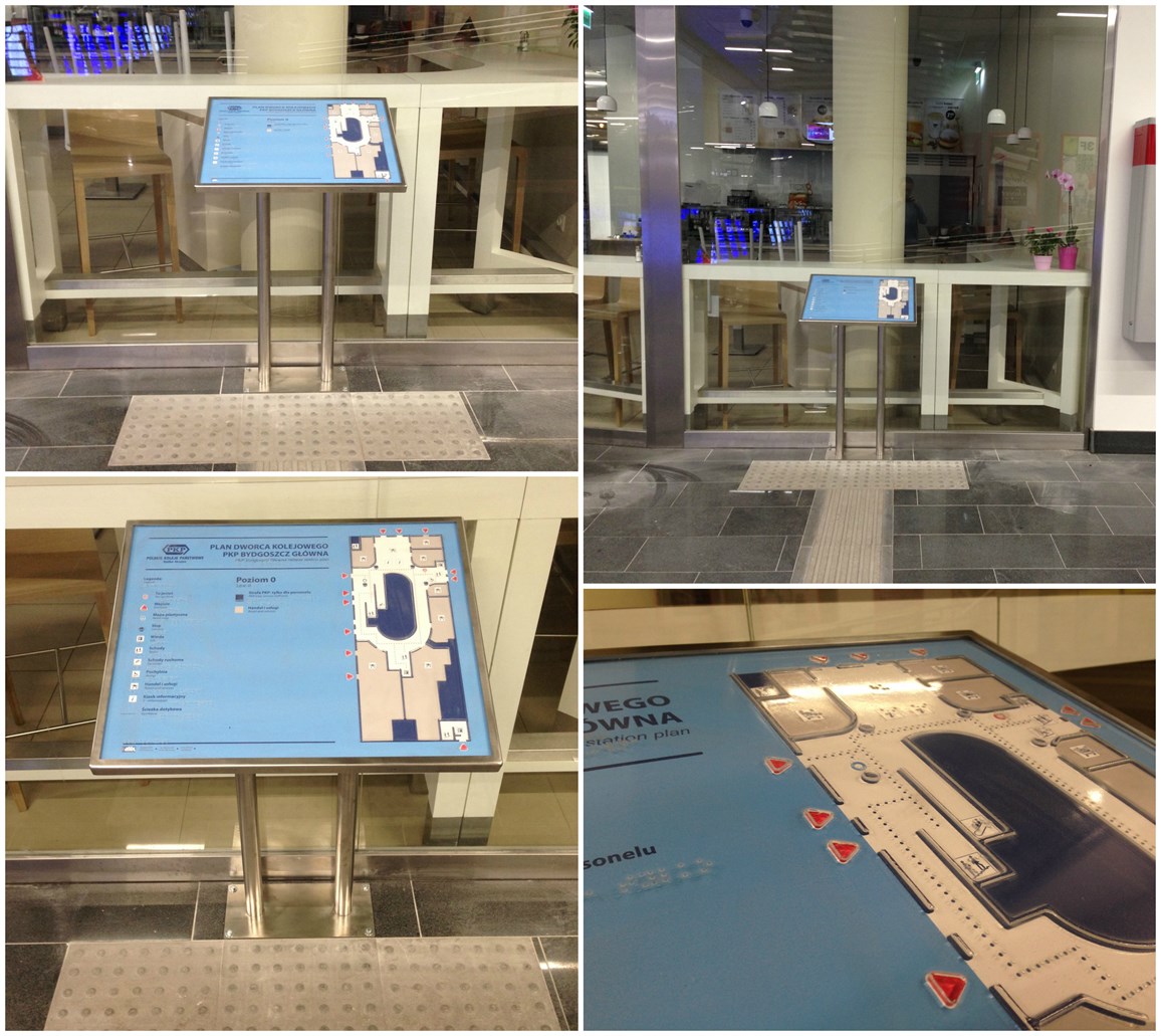 Realizacja obejmuje udźwiękowiony, dotykowy plan informacyjny, dwa dotykowe plany informacyjne, a także linie naprowadzające i pola uwagi na dworcu PKP w Bydgoszczy. Udźwiękowiony, dotykowy plan informacyjny ma postać tablicy usytuowanej na stojaku z chromowanej stali i ergonomicznie pochylonej w kierunku podróżnego. Plan znajduje się z prawej strony tablicy, legenda usytuowana jest centralnie i z lewej strony. Opatrzono ją metalowymi przyciskami, po których wciśnięciu podróżny otrzymuje głosowe informacje, właściwe dla wybranego elementu legendy. Plan jest utrzymany w korespondującej z otoczeniem kolorystyce – błękit, biel, beż, czerwień i granat. Dotykowe plany budynku dworca w postaci tablic zachowują tę samą kolorystykę i także są ergonomicznie pochylone. Jeden z nich znajduje się na dwunożnym stojaku z chromowanej stali, drugi na szerokim słupie, stanowiącym element architektoniczny wnętrza dworcowego budynku. Plany znajdują się w prawej części tablicy, zaś legenda w jej części lewej i centralnej. Legendy opisane są zarówno w czarnym druku, jak i w brajlu. W skład realizacji wchodzą ponadto linie naprowadzające i pola uwagi.