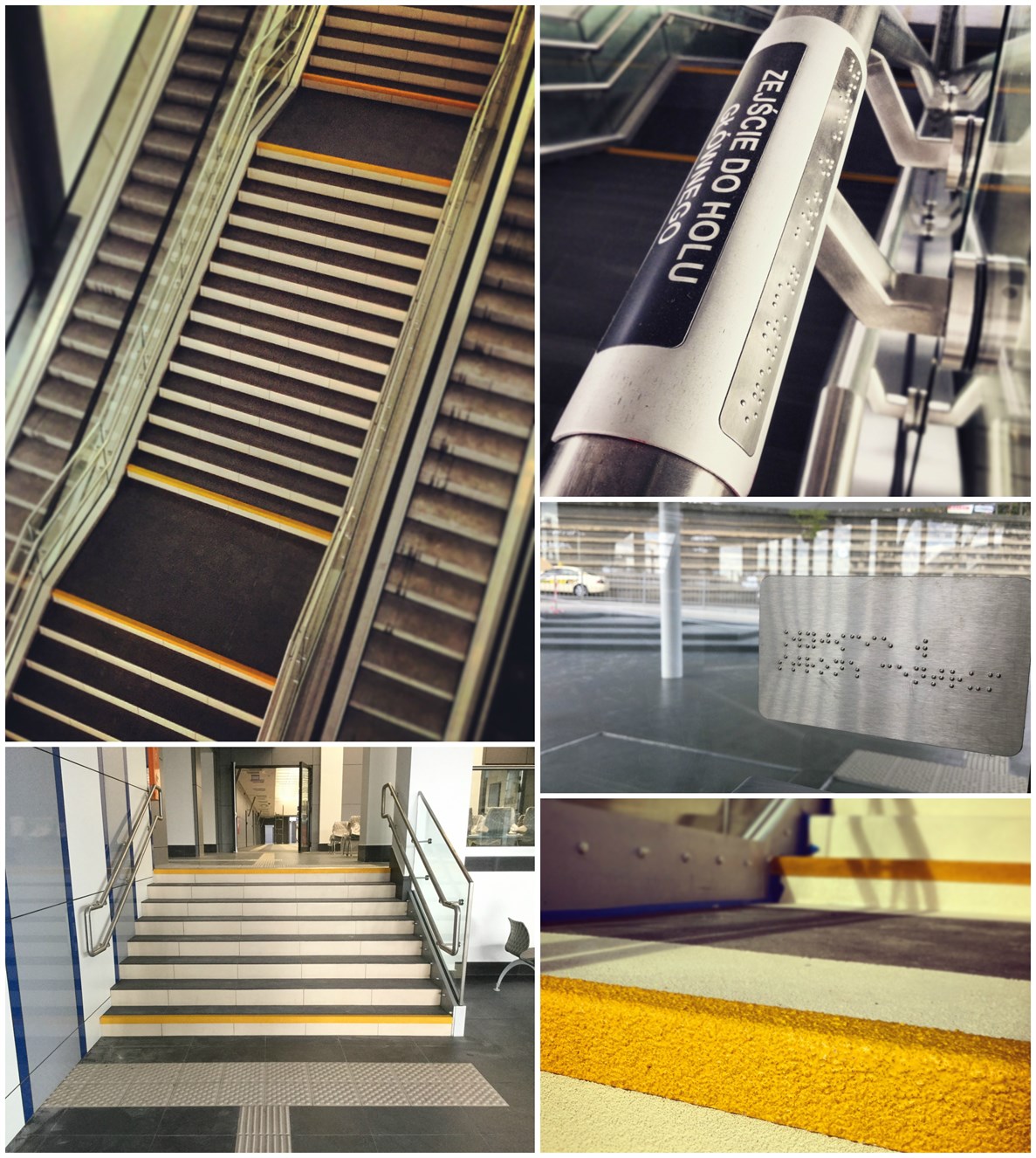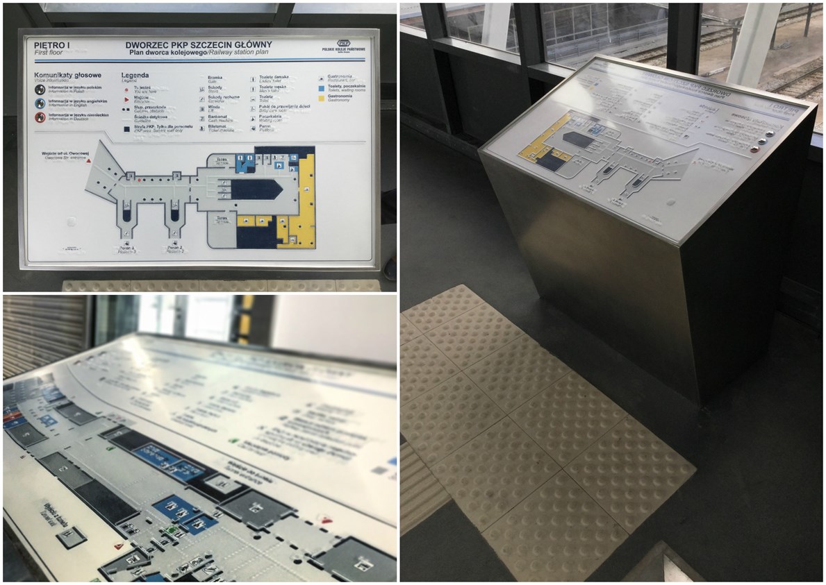 Realizacja obejmuje dotykowe plany informacyjne, brajlowskie tabliczki informacyjne na poręcze, oznakowanie schodów, linie naprowadzające i pola uwagi w budynku dworca PKP w Szczecinie. Ergonomicznie pochylone, dotykowe plany informacyjne mają postać tablic usytuowanych na ciemnych, prostopadłościennych postumentach. Utrzymane są w szaro-niebiesko-czarno-białej kolorystyce, korespondującej z architekturą wnętrza dworcowego budynku. Plany zajmują całą, dolną część tablic, zaś legendy ich górną część. Opisane są w czarnym druku i w brajlu. W skład realizacji wchodzą ponadto metalowe, brajlowskie tabliczki informacyjne na poręcze, żółte, kontrastowe oznaczenia schodów, a także linie naprowadzające i pola uwagi.