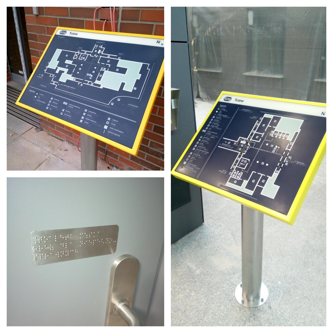 Realizacja na dworcu PKP w Tczewie obejmuje pięć dotykowych planów informacyjnych, metalowe tabliczki na drzwi z napisami w brajlu i brajlowskie, metalowe tabliczki na poręcze. Plany informacyjne mają postać biało-niebieskich tablic w żółtych ramach. Tablice umieszczone są w różnych miejscach obiektu i prezentują plany w perspektywie zależnej od tego, gdzie zostały usytuowane. Znajdują się na stojakach z chromowanej stali i są ergonomicznie pochylone w kierunku podróżnego. Plany usytuowane zostały poziomo, w górnej i centralnej części tablicy, wówczas legenda znajduje się na dole; bądź pionowo, w prawej i centralnej części tablicy, wówczas legenda znajduje się po lewej stronie. Realizacja obejmuje ponadto pięć metalowych tabliczek informacyjnych na drzwi, z napisami w brajlu, a także dwadzieścia osiem, wykonanych z metalu, brajlowskich tabliczek informacyjnych na poręcze.
