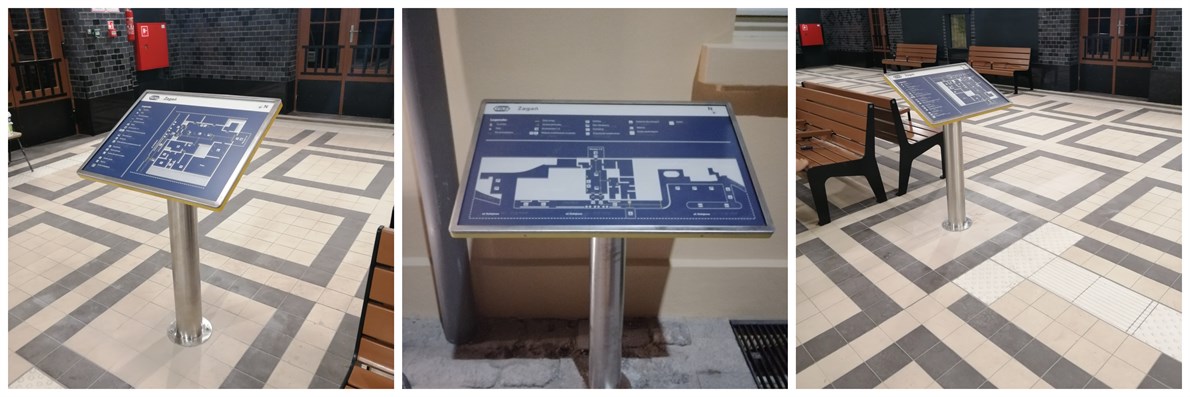 Realizacja na dworcu PKP w Żaganiu obejmuje dotykowe plany informacyjne i linie naprowadzające. Plany informacyjne mają postać ergonomicznie pochylonych tablic, umieszczonych na jednonożnych stojakach z chromowanej stali. Plany budynku dworca utrzymane są w biało-niebieskiej kolorystyce. Zostały przedstawione w perspektywie zależnej od miejsca ich usytuowania. Opatrzone są legendami w czarnym druku i w brajlu. W skład realizacji wchodzą ponadto linie naprowadzające.