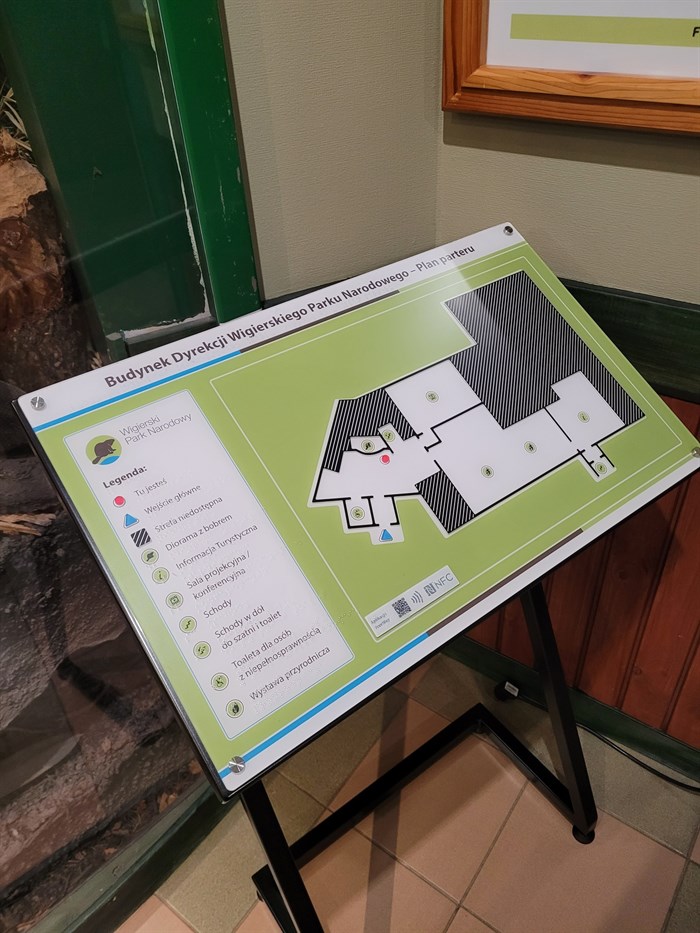 Tablica z planem parteru budynku dyrekcji parku została umieszczona na ergonomicznie pochylonym, dwunożnym stojaku ze stali malowanej proszkowo na kolor czarny. Pozostałe plany zostaną umieszczone na stojakach wykonanych przez zamawiającego.