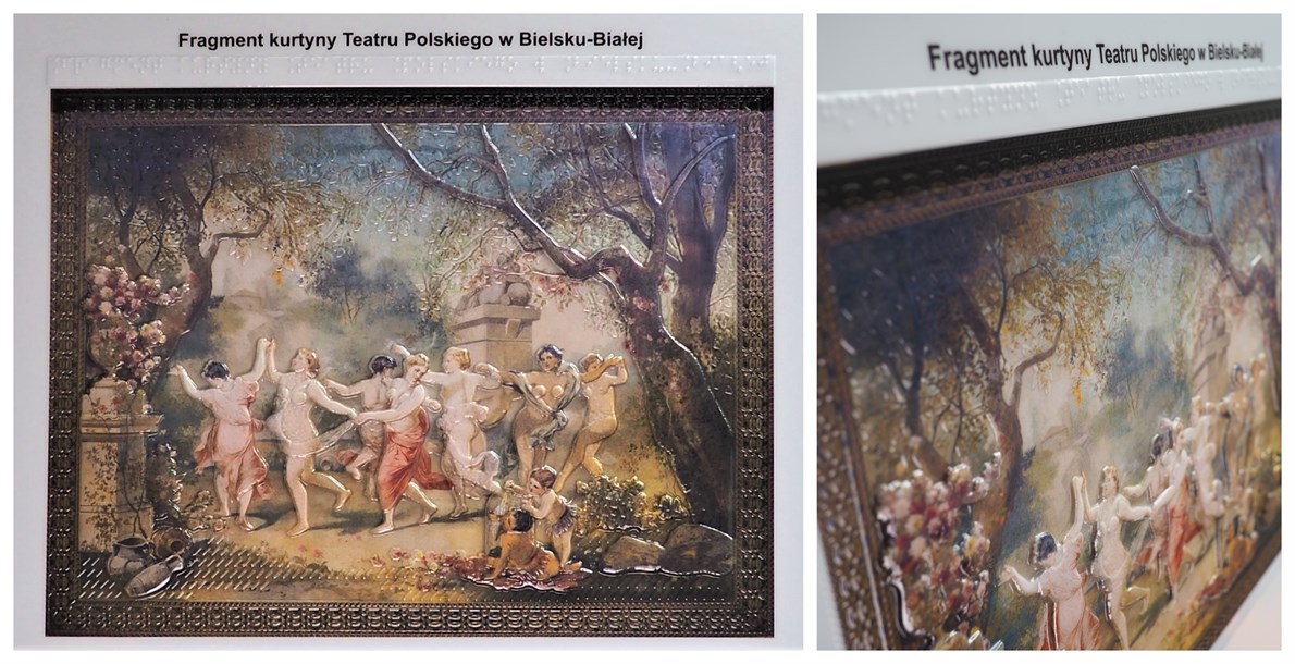 Dla Teatru Polskiego w Bielsku-Białej wykonana została termoformowana, wypukła, dotykowa, kolorowa grafika, przedstawiająca fragment zabytkowej kurtyny teatralnej. Kurtyna jest dziełem Franza Angelo Rottonara. Powstała w roku 1890, w technice obrazu olejnego na płótnie, w pracowni Josefa Kautsky’ego w Wiedniu. Kurtyna ma osiem metrów szerokości i sześć metrów wysokości. Termoformowana grafika, choć prezentuje jedynie niewielki jej fragment, pozwala docenić kunszt autora dzieła.