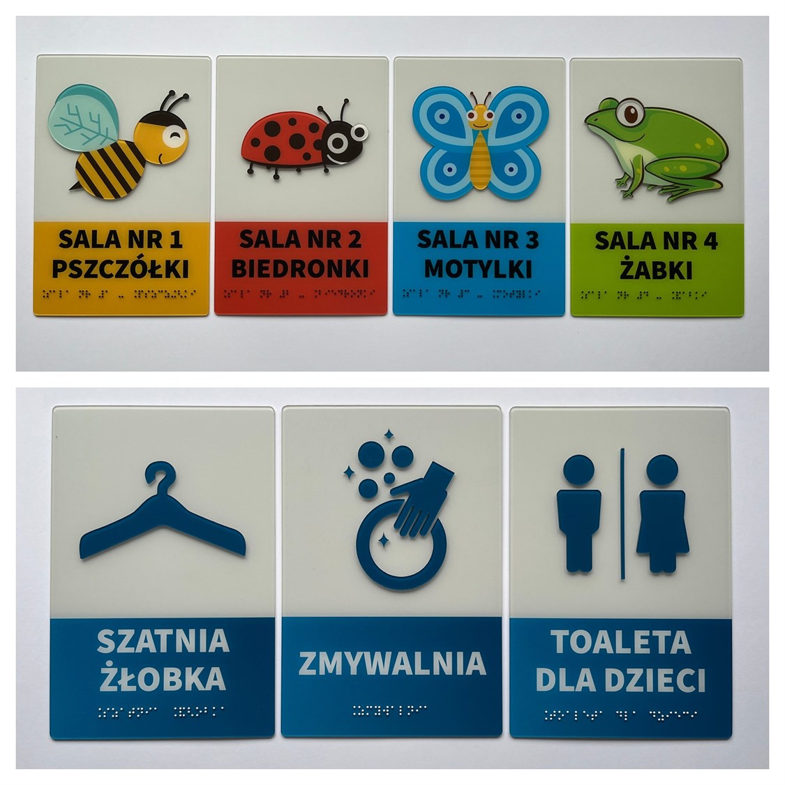 Tabliczki informacyjne z nazwami poszczególnych sal są utrzymane w dziecięcej konwencji. Zawierają bardzo estetyczne, kolorowe piktogramy, a także napisy w czarnym druku i w brajlu. Pozostałe tabliczki z piktogramami i napisami w czarnym druku i w brajlu są biało-niebieskie.