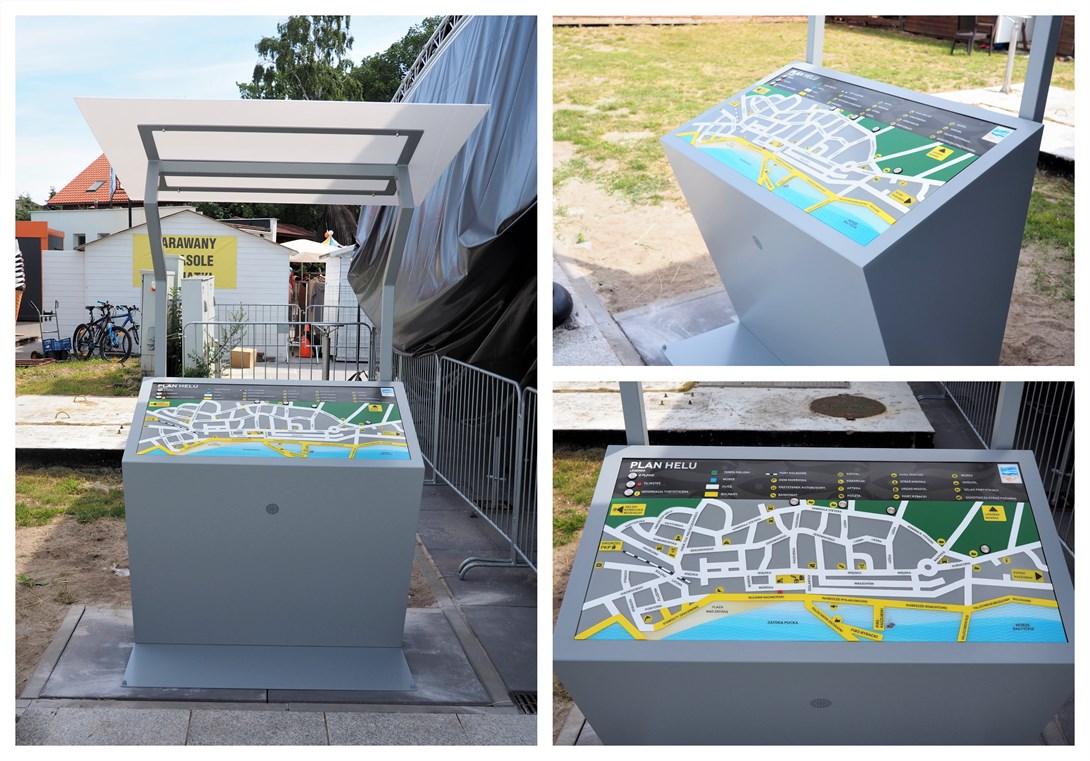Realizację stanowi tablica z udźwiękowionym planem informacyjnym miasta Hel. Udźwiękowiony plan umieszczony jest na masywnym postumencie z malowanej proszkowo stali. Postument utrzymany jest w kolorze jasno grafitowym. Tablica jest ergonomicznie pochylona w kierunku przechodnia. Zawiera ona wielokolorowy, udźwiękowiony plan informacyjny miasta, komponujący się kolorystycznie z otoczeniem. Legenda planu opisana jest w brajlu i w czarnym druku i jest także udźwiękowiona. Po wciśnięciu jednego z metalowych przycisków, przechodzień otrzymuje m.in. głosową informację na temat obiektu, któremu odpowiada udźwiękowiony element planu czy jego legendy.