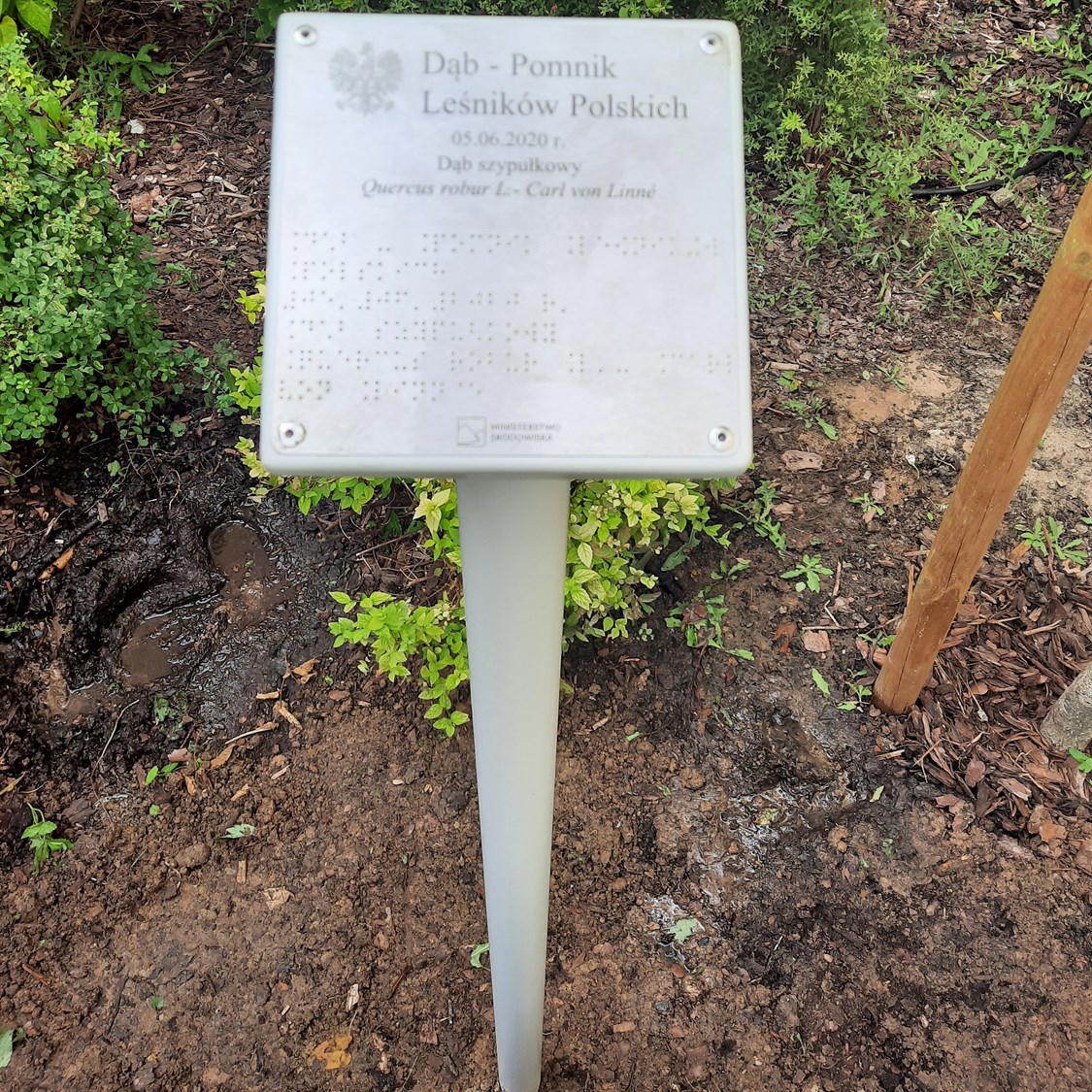 Dotykowa, metalowa tablica z grawerowanymi napisami czarnodrukowymi i brajlowskimi, informująca o posadzeniu dębu szypułkowego przed warszawską siedzibą Ministerstwa Środowiska. Tablica ułożona jest poziomo i jest ergonomicznie pochylona w kierunku czytającej ją osoby. Znajduje się na metalowym stojaku, wkopanym w ziemię. Tekst czarnodrukowy i brajlowski informuje m.in. o tym, że posadzony dąb stanowi Pomnik Leśników Polskich. W lewym, górnym rogu tablicy wygrawerowany jest polski orzeł w koronie.