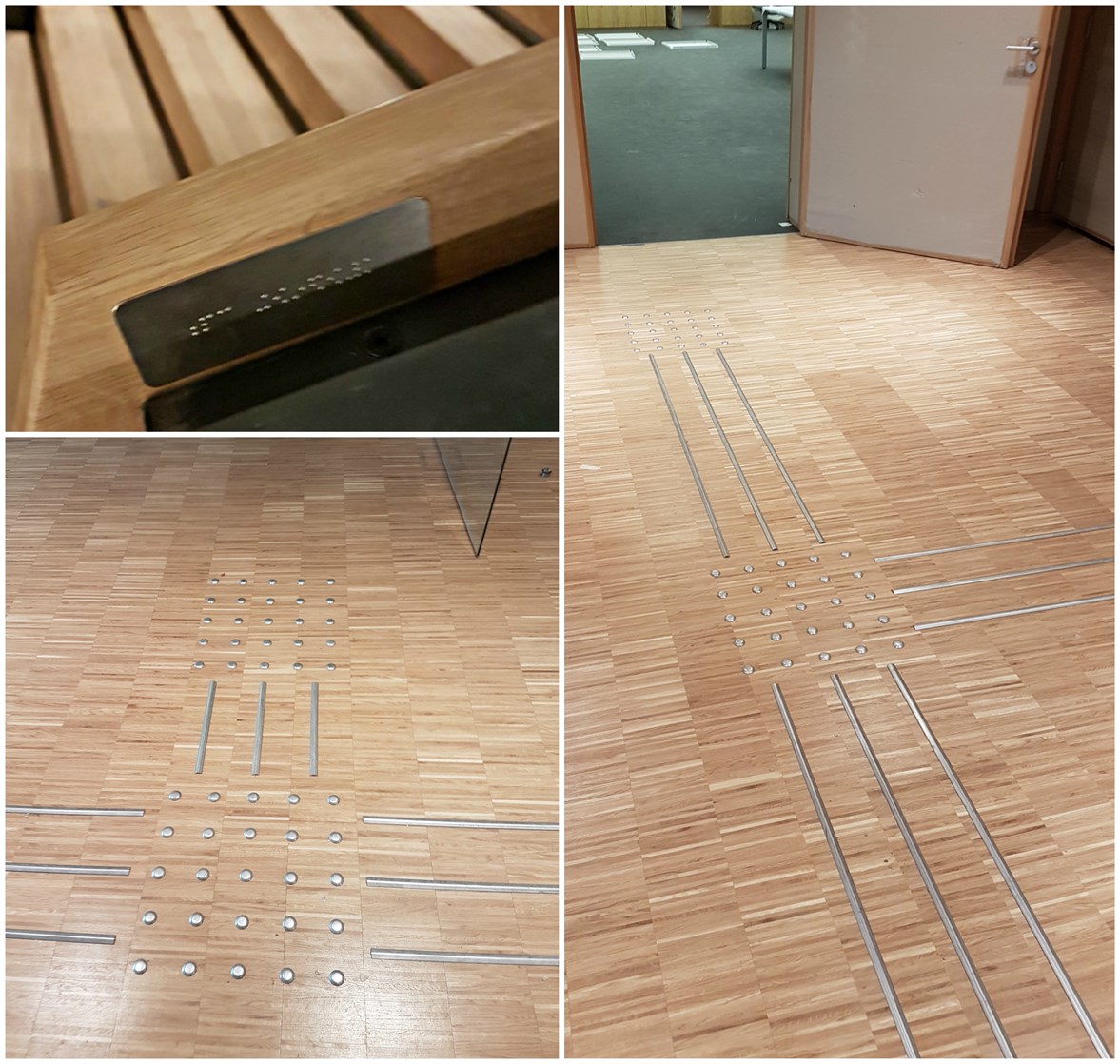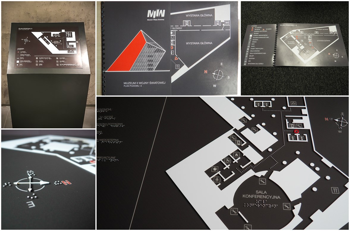 Realizacja obejmuje dotykowe i papierowe plany informacyjne, brajlowskie tabliczki informacyjne na poręcze, linie naprowadzające i pola uwagi w budynku Muzeum II Wojny Światowej w Gdańsku. Dotykowe plany informacyjne korespondują z charakterem obiektu. Mają postać czarno-białych, ergonomicznie pochylonych, dotykowych tablic z tworzywa PMMA, umieszczonych na czarnych, prostopadłościennych postumentach. Plany wyposażone są w czarnodrukowe i brajlowskie legendy, a także w dotykowe róże wiatrów, wskazujące kierunek. Plany papierowe utrzymane są w tej samej kolorystyce i konwencji. W skład realizacji wchodzą ponadto estetyczne, metalowe, informacyjne tabliczki na poręcze, a także poziome linie naprowadzające i pola uwagi.